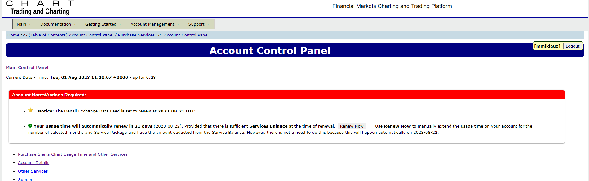 Dear Sierra Chart Team, when I look in my account control panel it said "- Notice: The Denali Exchange Data Feed is set to renew at 2023-08-23 UTC.", however when I look at Denali Data Feed Exchanges it says Ending Date 2023-08-31. Which of these dates is correct and until when does my market data free trial last? (of course if I extend the subscription for service pack 11) Thank you, |