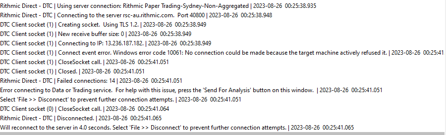when trying to connect to rithmic data and keep getting windows error code 10061. i've turned off all my firewalls and tried with still no success as well as turned the ports on sierra chart on and off but still nothing is working? Please see photo attached of my message log when trying to connect thanks |