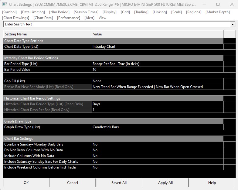 I am using 10 tick range bars for ES with the attached chart settings. When current selected service is "Rithimic Direct - DTC [trading]", the begin and end time of range bar candles and hence the OHLC values are different from when it's selected to be "SC Data - All Services [data]". What can be the reason? |