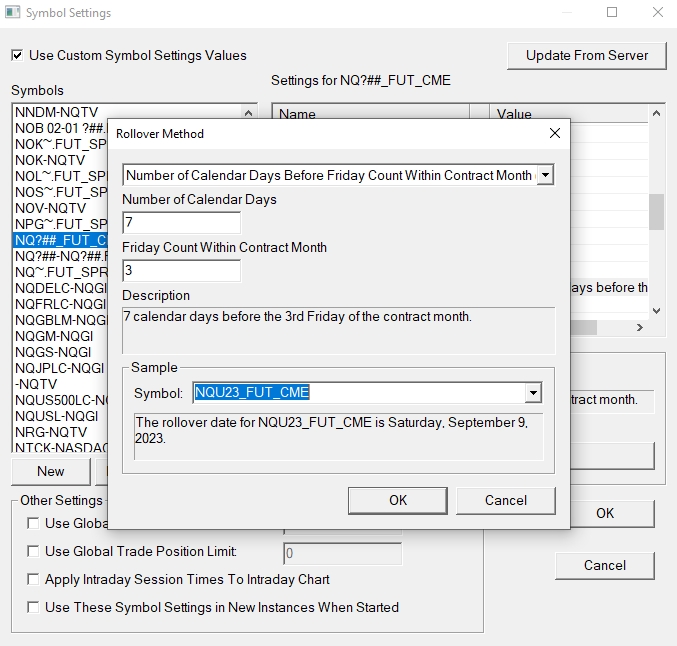 Hi John, thanks! Please see attached. For NQU23, the calculated rollover date is Saturday, September 9th, 2023, which is wrong (7 calendar days before Sept. 15th is Sept. 8th, not the 9th). For NQU24, the calculated rollover date is Friday, September 13th, 2024, which is right (7 calendars days before Sept. 20th is Sept. 13th, is correct). I have also used this setting for three past rollovers, and it never before calculated a Saturday as seven calendar days before a Friday. Given the above, it seems like something has to be wrong with the rollover dates for NQU23, right? Thanks again! Date Time Of Last Edit: 2023-09-11 11:09:51