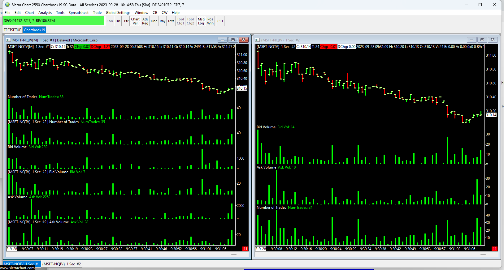 The Number of Trades is the same for the normal symbol and the custom calculated symbol, the Ask Volume and Bid Volume is not the same as those from the normal symbol, the Total Volume does equal the sum of the Bid and Ask volumes... Making a {MSFT-NQTV} symbol and comparing it's chart to the MSFT-NQTV chart shows the same problems as the futs charts It seems that incorrect Bid and Ask volumes for the Custom Calculated Symbols is the basis for the discrepancies https://www.sierrachart.com/image.php?Image=1695910500969.png Date Time Of Last Edit: 2023-09-28 14:16:07