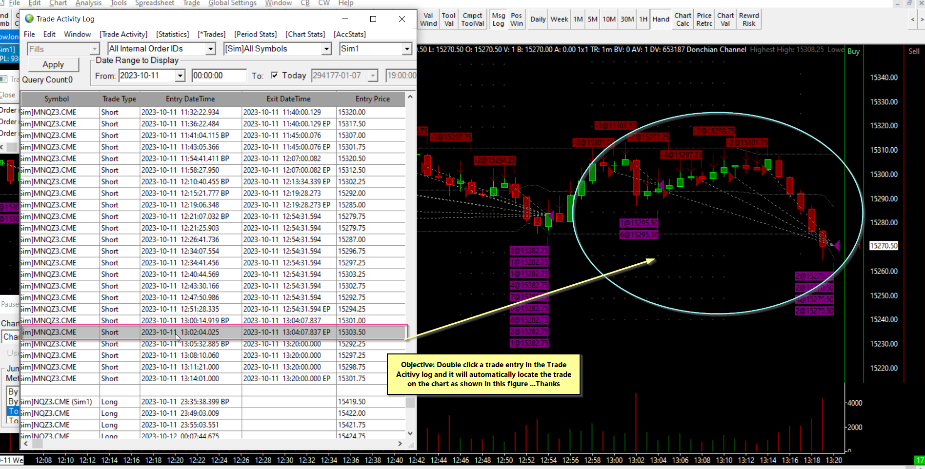 Hi Support. I would kindly appreciate if there is an opportunity to add this feature. Objective: ----------- Double click a trade entry in the Trade Activity log and it will automatically locate/map the trade on the chart as shown in the attached figure. This will be a very supportive to review the trade executions with an instant mapping on the chart from the trade log. ----------- On another request: Is it possible to have charting curves for the data presented in the trade log as visual charting of the data series. It can be very efficient in tracking performance. It is absolutely valid now to copy the trade log to Excel and do charting from excel. The request if this would be added automatically within SC platform. However, the first request is higher in terms of priority.. Thanks a lot for your help and support to continuously add enhancements to SC ... |