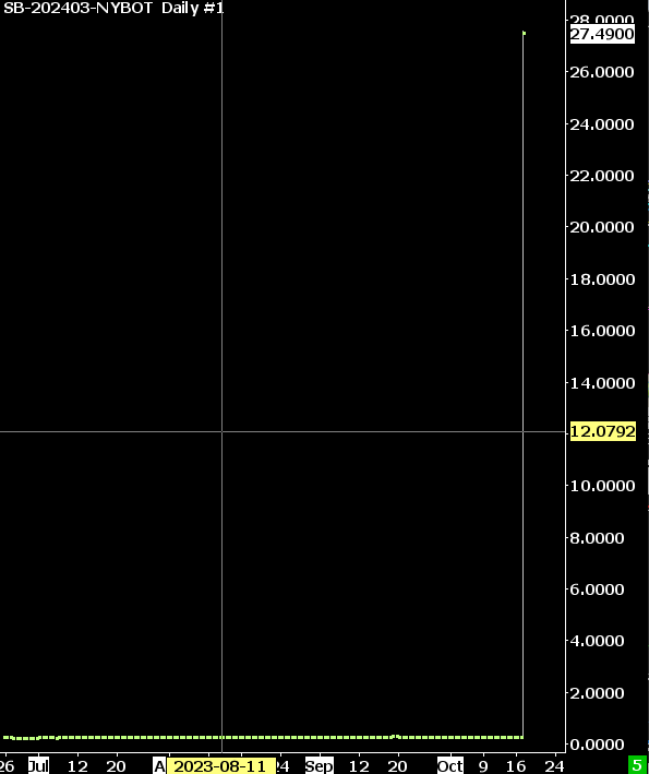 1. Previous historical data is downloading and displaying, there is an error in the price data for the current historical bar, it starts and draws from 0 whether on a Daily, Weekly, or Monthly, this is only happening on this SB symbol since subscribing to realtime data for it on ICEUS through IB, image attached. How can I fix this, or get this historical data from SC service, while in subinstance connected to IB for trading? 2. Longer historical intraday history is not loading and displaying, even though it shows it is being downloaded for past contract months, and other symbols on this same chart show the full history. Days to load is set high both on the chart, and in the DTS settings. Tried doing in main instance also, updating symbol settings, deleting and downloading all data, etc. Date Time Of Last Edit: 2023-10-18 03:32:12