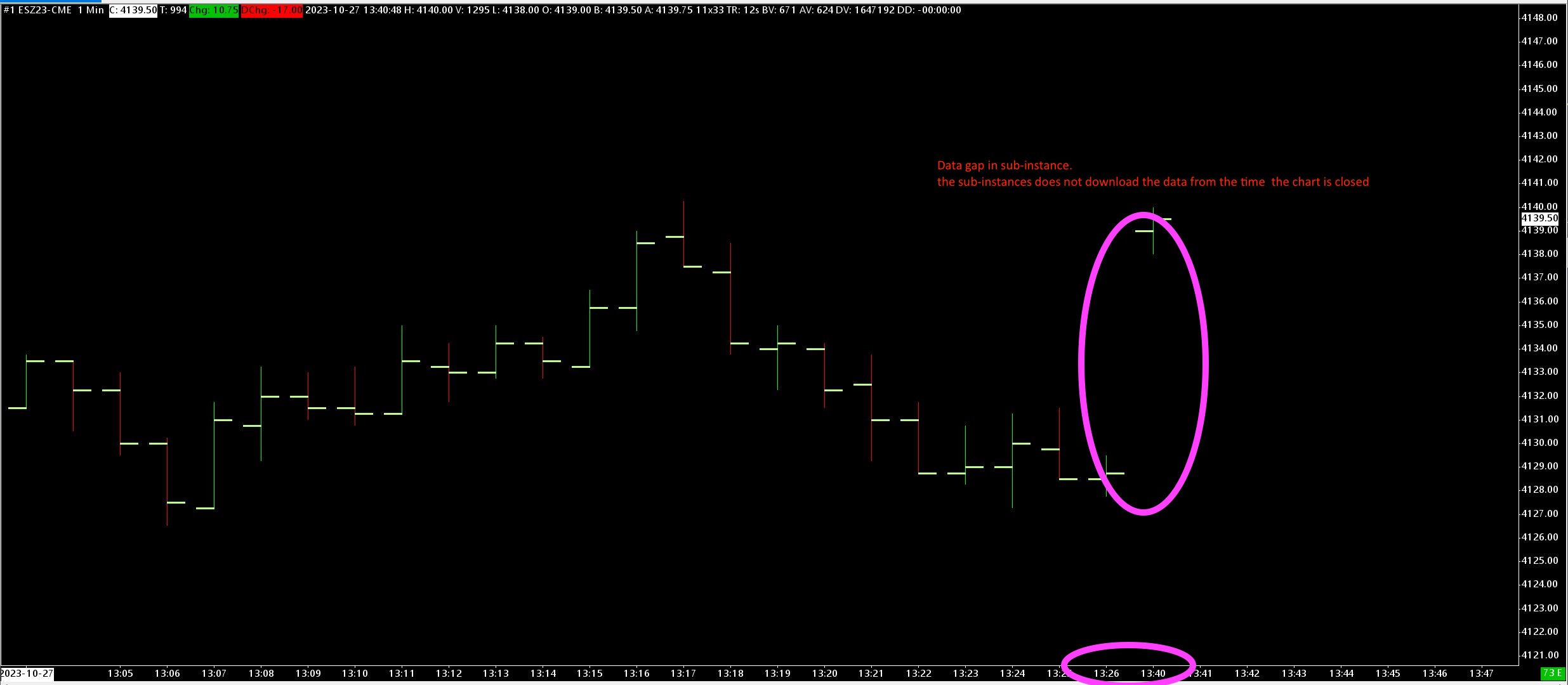 Hello, i have created two new chart-books one in main instance and another in sub-instance. Both of these chart-books have same symbol which is ESZ23-CME. downloaded the data when i opened these charts in these two chart-books. Saved and closed both these chart-books (in main instance and sub instance) Then closed the Sierra chart completely and turned-off the PC. After 15mins logged back into both Main instance and sub-instance opened both chart-books in respective instances. The chart in main-instance downloads the data that was missing for 15mins. but the chart in sub-instance DOES NOT download the data that was missing for 15mins. Please see the screenshots attached. This issue is making sub-instances un-usable at all. FYI: I'm using SC in SIM mode and selected "SC Data- All services" and i have tried the following on the sub-instance: - Tried disconnecting and reconnecting to the data and no use. - Tried doing "Edit>> Edit/download Data - intraday chart" and this makes the chart even worse. Please see the screenshots attached |