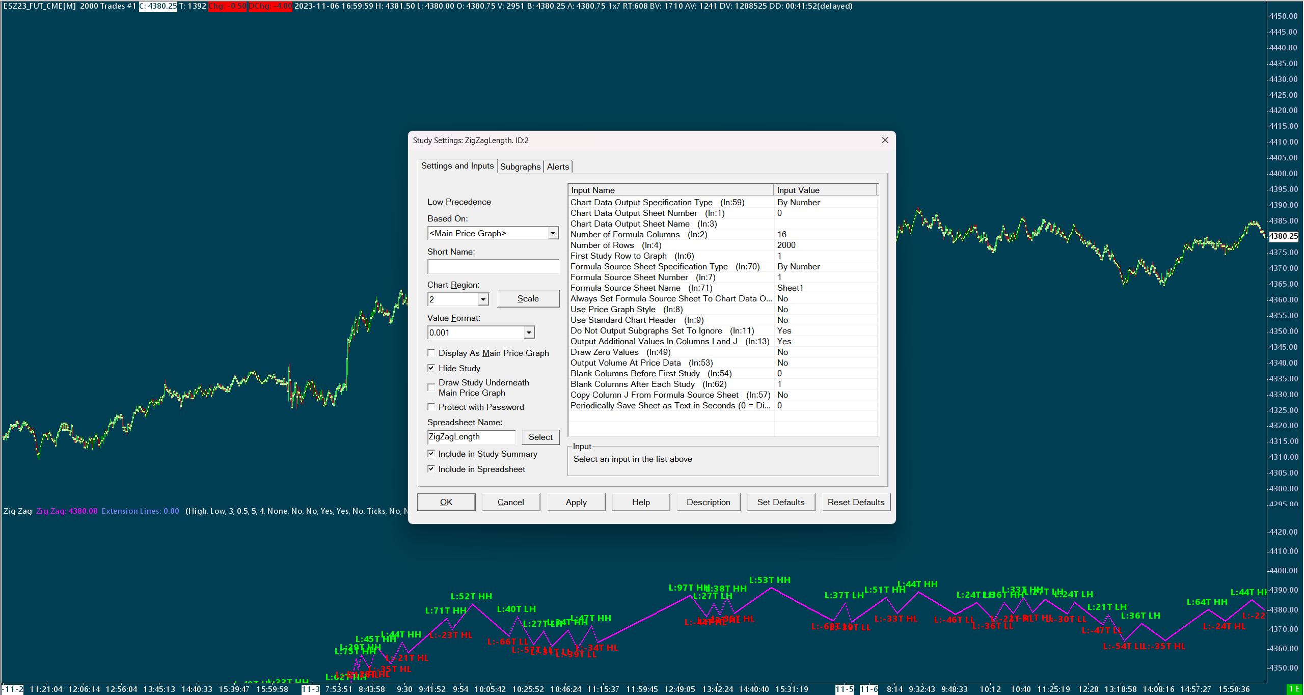 Dear Sierra Staff, It is hoped that this finds you well. I am unable to access ZigZag length from a spreadsheet, its visuals are attached below (but briefly though there is a value for ZigZag, there are only zero values for ZigZag length) (Image 1). I, initially, wondered if it might be a case of the tick-size (2000) of the candle-sticks being too small for there to be no ZigZag transition in even 2000 rows but changing the tick-size of the candlesticks to 20,000 had no effect. I also tried turning on "Display HH,HL,LL,LH Labels" but that had the effect of turning the zeros to numbers representing swing structure (as intended) and no additional column being added for ZigZag length (Image 2). I have attached screenshots of the spreadsheet under both conditions, and those of my settings for the spreadsheet study (Image 3, could not access edit to take image). Your assistance in moving forwards is much appreciated (for I am rather lost). Kind Regards https://www.sierrachart.com/image.php?Image=1699311124343.png https://www.sierrachart.com/image.php?Image=169931122779.png |