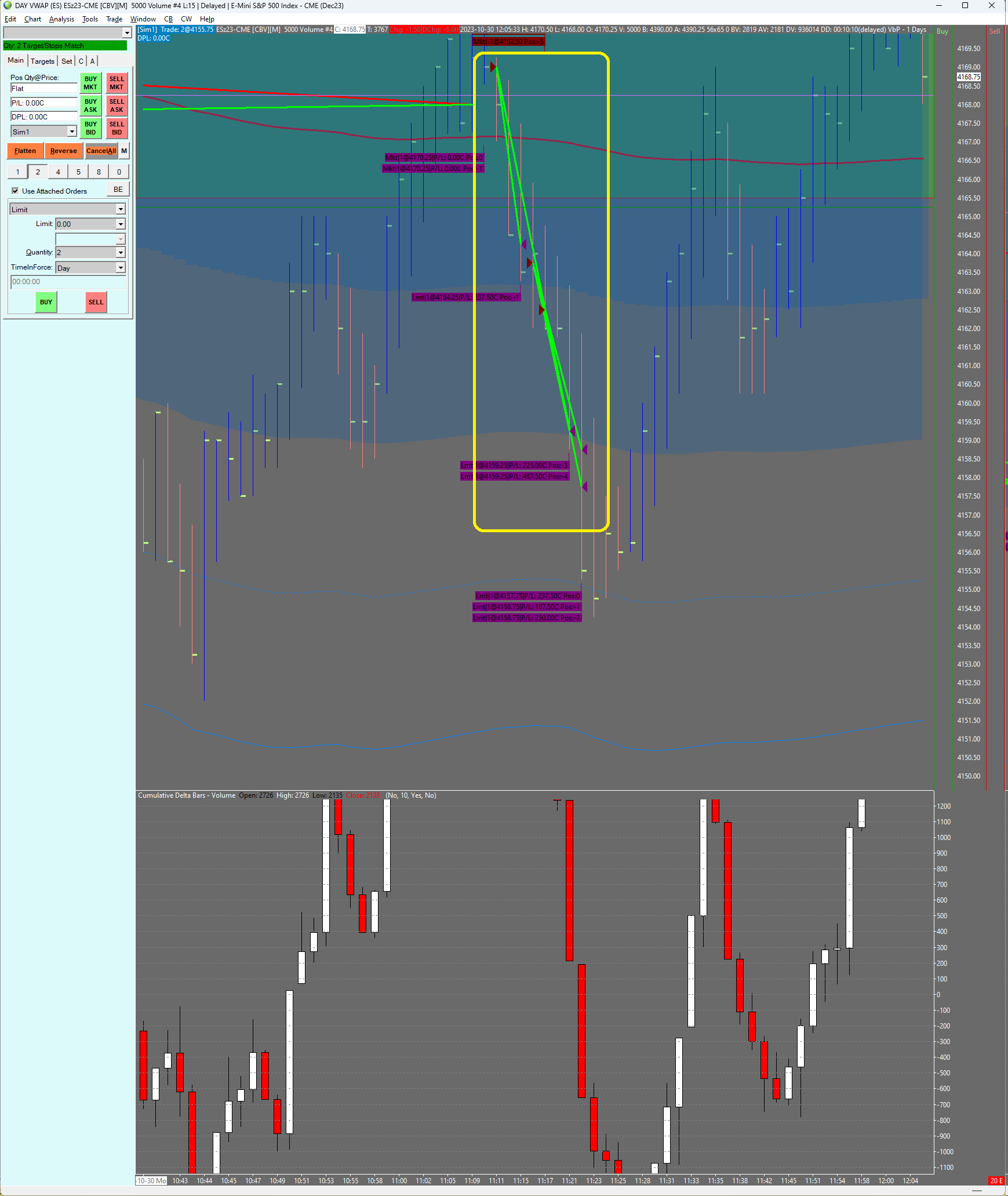 Moin Moin. From my trading-mentoring at g7fx.com I was trading using the sim-account, and had some trades I wanted to share.: However, as I was working, I could not attend the market in time, so I did trade on replay. Everything did work fine aside from a lot of weird multi-day-spanning contract-sales (ESz23), which I did not enter, and which where there, seeming to have been opened right at the end of the last session. The real trades ( at least from 2023-10-26 on) are.: 1. from 2023-10-26 12:27:45.805967 to 2023-10-26 12:37:46.396097 2. from 2023-10-30 11:11:24.153005 to 2023-10-30 11:22:33.023001 Funnily, : a. the trade 1 is not even being displayed in "1st real trade does not even appear.png" , b. whilst the trade 2 does appear just fine in "2nd real trade.png" I did attach the trade-log as "TradeActivityLog_2023-11-08, weird trades, only the ones from 2023-10-26 12.27 to 12.37 and 2023-10-30 11.11 to 11.22 are real.txt" . Last Thursday on the 2023-11-07, when I did have my last mentoring-session, I was sure to had a flat account-inventory. But, I did see a P&L of -15k$. It did comprise weird trade-arrows spanning very long times. Can it be, that putting my machine into standby did mix up the messages with Your Teton-Sim-Server. _Cheers, __Michael. |