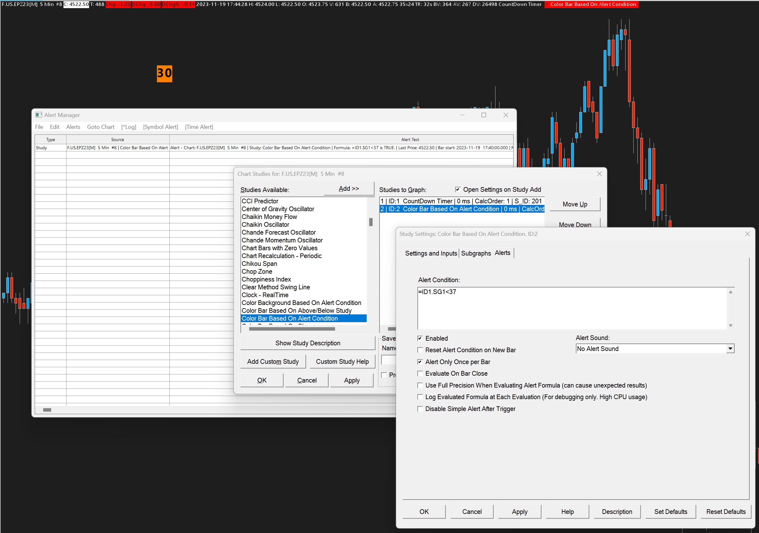 Add CountDown Timer to a 5 min chart. Add Color Bar Based On Alert Condition to generate your trigger. Set the Alert for when there are 37 seconds left on the timer. See attached for how this looks. |