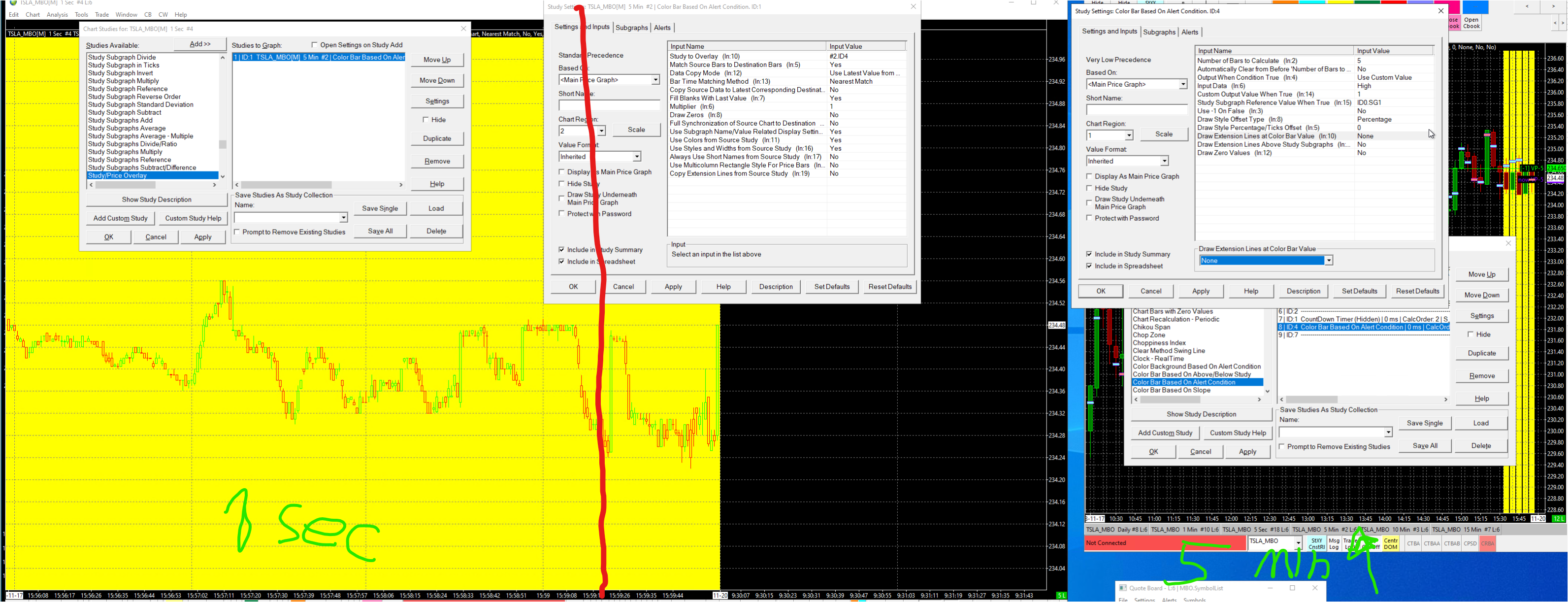 thank you both ! .... " Add CountDown Timer to a 5 min chart. Add Color Bar Based On Alert Condition to generate your trigger. Set the Alert for when there are 37 seconds left on the timer. See attached for how this looks. " /// in the right pic there is the 5 min chart, which in there i did what u mention. in the left pic there is the 1 sec chart which in there i want to get the red line that i draw(every 4:23 min, and in this exa, it is at 15:59:23). as u can see i got "yellow" at all backgroud.... what i need to change to get the line at 15:59:23? thank you |