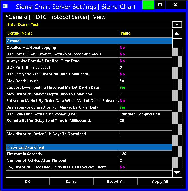 This is why we suspect power management. Sierra Chart being more efficient, it may be assigned to a lower power core causing it to run more slowly. There's something unusual going on in your case. To rule out other things we did not think of try a new installation of Sierra Chart with the default configuration and then make the adjustments for performance, link given in the prior post, and set the Sierra Chart server settings as shown in the screenshot. And you are still not even seeing the true speed in that video. The video does not show it. Sierra Chart Support - Engineering Level Your definitive source for support. Other responses are from users. Try to keep your questions brief and to the point. Be aware of support policy: https://www.sierrachart.com/index.php?l=PostingInformation.php#GeneralInformation For the most reliable, advanced, and zero cost futures order routing, use the Teton service: Sierra Chart Teton Futures Order Routing Date Time Of Last Edit: 2023-11-28 20:27:19