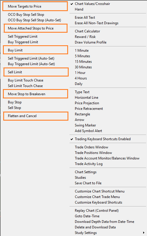 I am trying to customize the Chart Trade Menu that is shown when right clicking on a chart. I am trying to put in a large amount of space between different groups, to separate the distance the mouse has to move to avoid accidentally clicking the wrong menu item. Adding multiple separator tabs/lines does not do this, and any duplicate separator lines are automatically removed upon saving and re-entering the Customize Chart Trade Menu window. I currently use hotkeys for most of this, but am trying to build in redundancy in case the keyboard goes out. Currently I am putting in a lot of garbage values (menu items that I never use) to create space between the items I need to use. I'm just curious if there's a way to add more space between the selection items so I don't have to buffer it with other order types to create a visual contrast. Thank you. Edit: I have attached an image of the Chart Trade window with the main items I use highlighted in orange. The rest of the text is used as filler to be able to separate the items I only care about using. I'm trying to see if I can get rid of this filler and just have open space. Date Time Of Last Edit: 2023-12-07 21:08:34