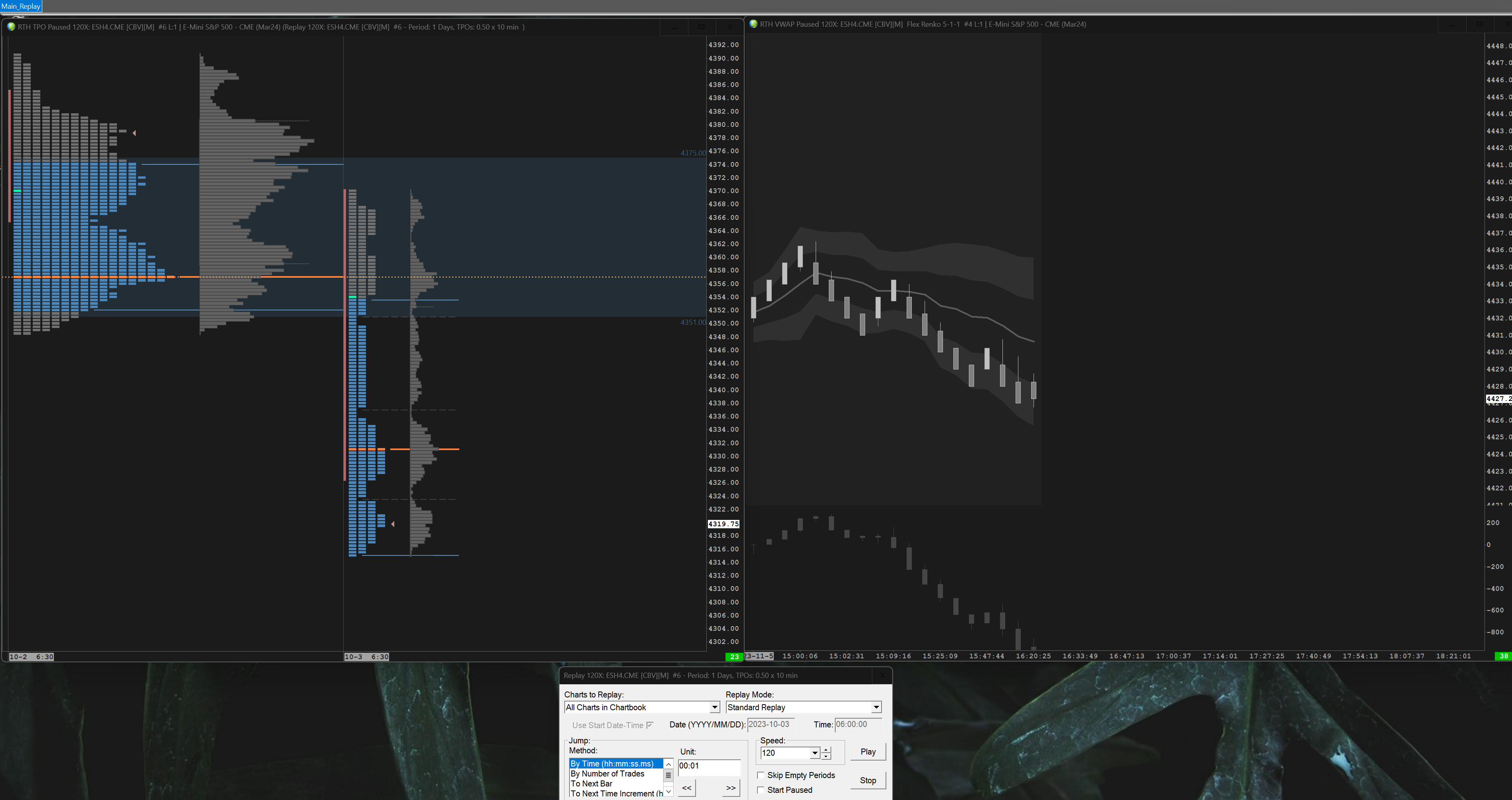 Hi I'm trying to use market replay for two charts, left chart being RTH TPO and Right chart showing Renko. For some reason they both seem to be using moving on different time frames and I'm not sure why I'm on ES using Pacific time so the market should open at 6:30AM Date Time Of Last Edit: 2023-12-17 21:44:17