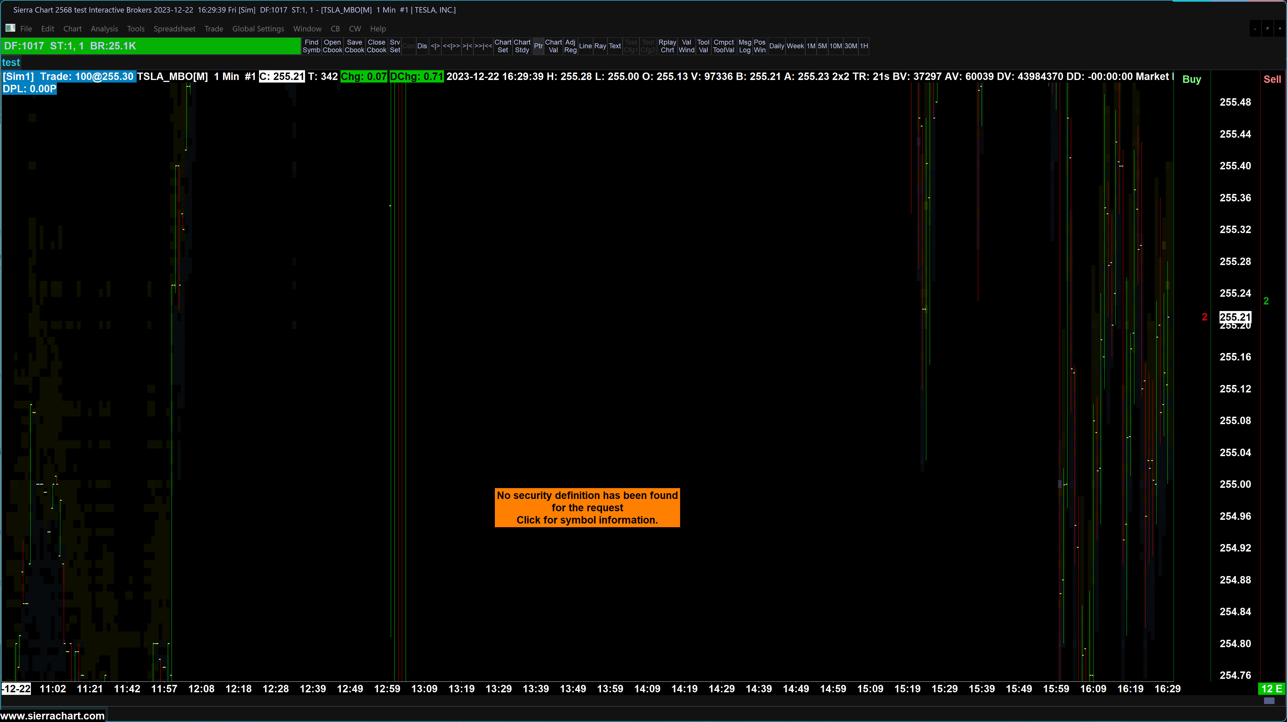 Here is the image you requested (IB connected, with market depth study on the chart): https://www.sierrachart.com/image.php?Image=1703262580688.png -- Here is an additional image showing the same chart and settings on the SC Data service only, with the market depth study. This is also how it looks when I connect to IB, with no market depth study on the chart: https://www.sierrachart.com/image.php?Image=1703262781456.png |