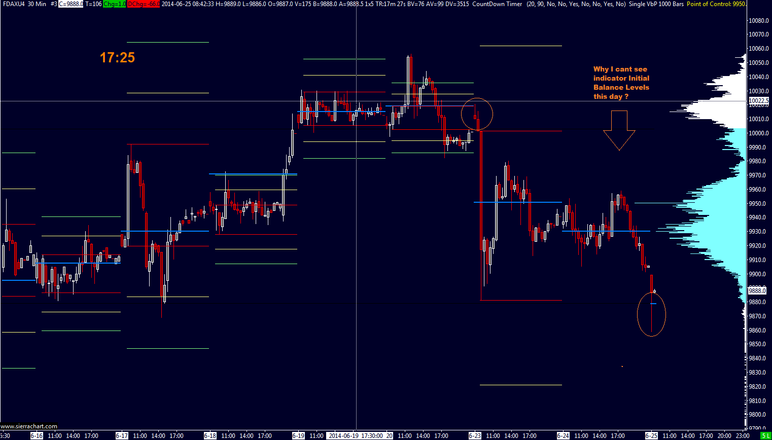Hi, I have problem witch view TPO graph. When I look at the candlestick chart, everything is OK. But the TPO chart does not show me the actual price and the price of the TPO some errors. Both charts have been updated. Where could be the problem please? I attach the screen. One more question, why not show the indicator "Initial Balance Levels" (candlestick graph) on the last day? The "Daily OHLC" this day is OK. Thank you. Date Time Of Last Edit: 2014-06-25 07:17:25