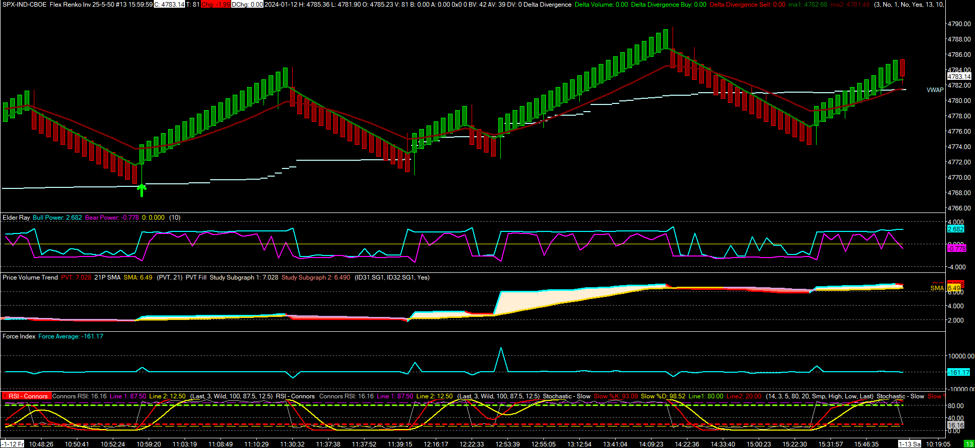 Yes. Symbol SPX Chart Settings >> Bar Period: Bar Period Type: Flex Renko Inverse Set, Bar Period Value: 25-5-50, Bar Period Bar New Bar Mode: New Trend Bar After Range Met | New Reversal Bar When Reversal Amount Met Plus 1 Tick and References Prior Close For the Bar Period Value, I usually use a small value, typically 1 to 5 for the middle number and the last number is twice the 1st number. Chart >> Graphic Draw Types >> Renko Brick With Wicks Delta Divergence Study for the Arrow. Trend Following Mode (ln:4): No https://www.sierrachart.com/image.php?Image=1705244868825.png Date Time Of Last Edit: 2024-01-14 15:23:14
