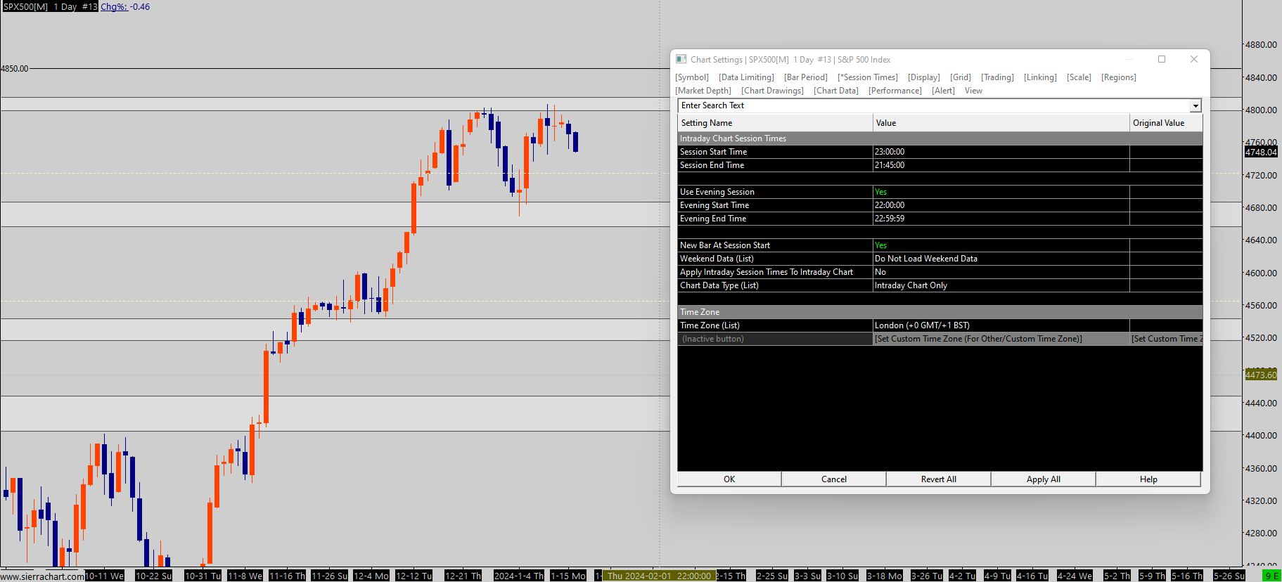 I am trying to set the correct times on SPX500 without any luck. I have looked through all of the instructions and support threads, nothing works. The session times are correct. I have tried different session times, timezones, no evenning session etc and the problem still remains.. The chart isn't showing Friday, instead it skips to Sunday. What is happening? https://www.sierrachart.com/image.php?Image=1705474697458.png Date Time Of Last Edit: 2024-01-17 06:58:30
