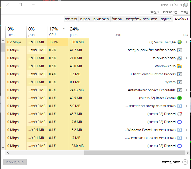 Hello guys, in the last times I openned the Sierra Chart and the program is really slow loading the details. Sometimes while trading the computer stucks. CPU jump over the sky. attached photo. Tried: - Disk Cleaner - Ccleanmer - Compputer settings and shutdown other programs Will be glad to get help with that. Thank you. |