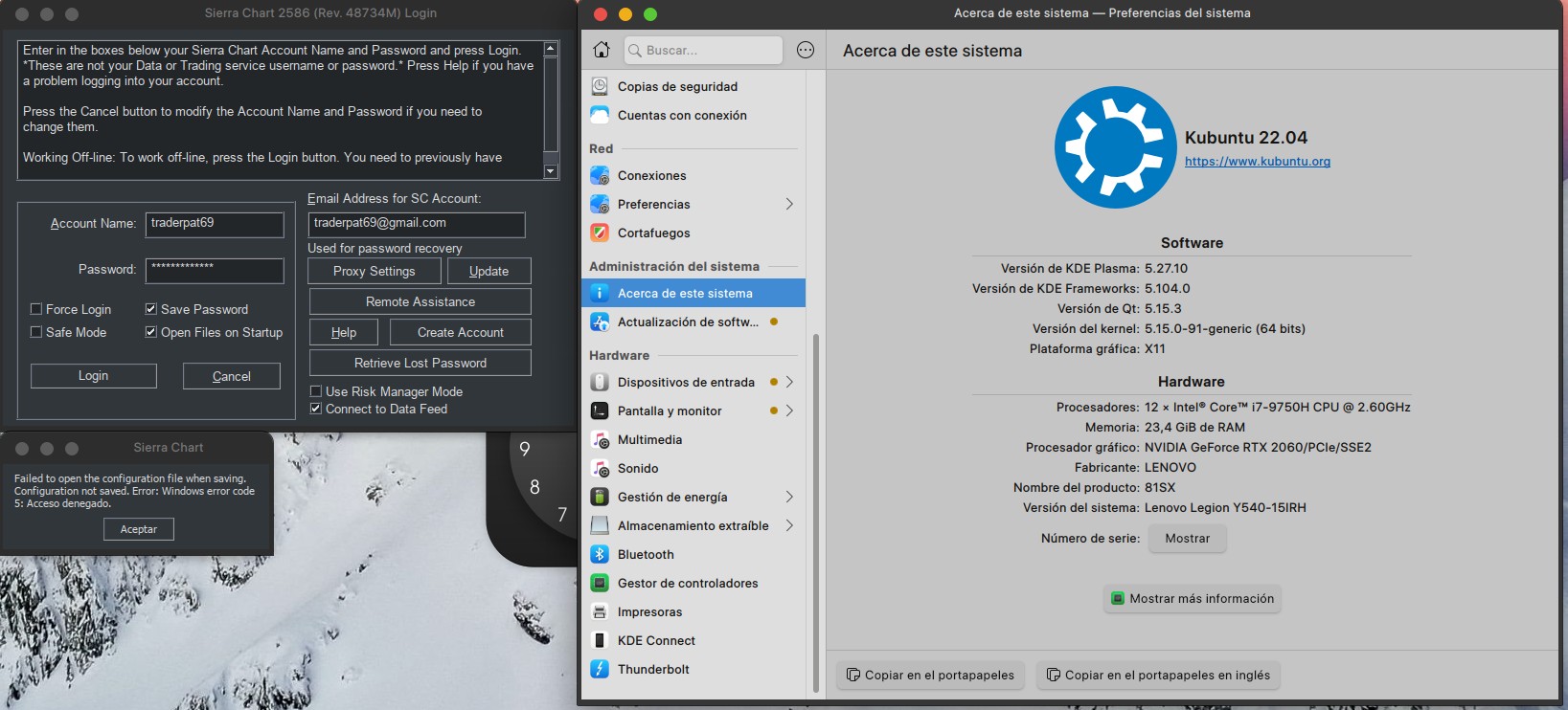 Good afternoon, I always start the platform without graphics, and once it connects to the data feed, I load the graphics, the problem is that it takes 8 minutes, but now after updating with the zip installer gives me this error, and does not load the platform (image attached). Hardware: Lenovo LEGION5 Y540-15IRH 25 GB RAM 2 TB SSD Software: Kubuntu 22.04 Plasma 5.27.10 kernel 5.15.0-91-generic (64bits) Translated with DeepL.com (free version) |