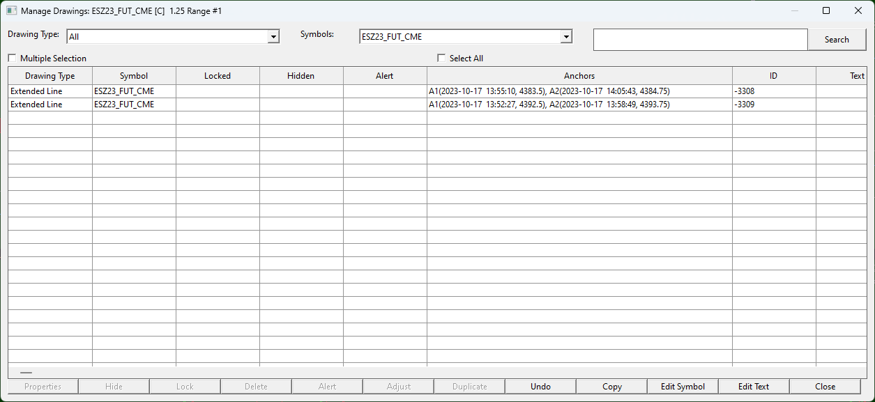 Hello I don’t know if it is by purpose or a bug. The fonts in the Manage Drawings Window of the version 2591 are IMHO too fat/large. Please have a look at the two screenshots. One of Sierra Chart Version 2586 and one of version 2591. Kind Regards |