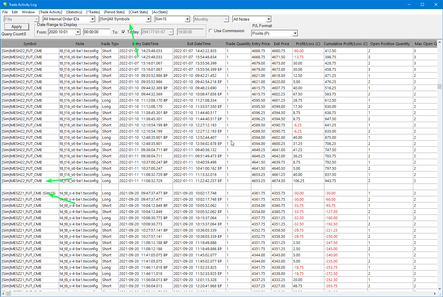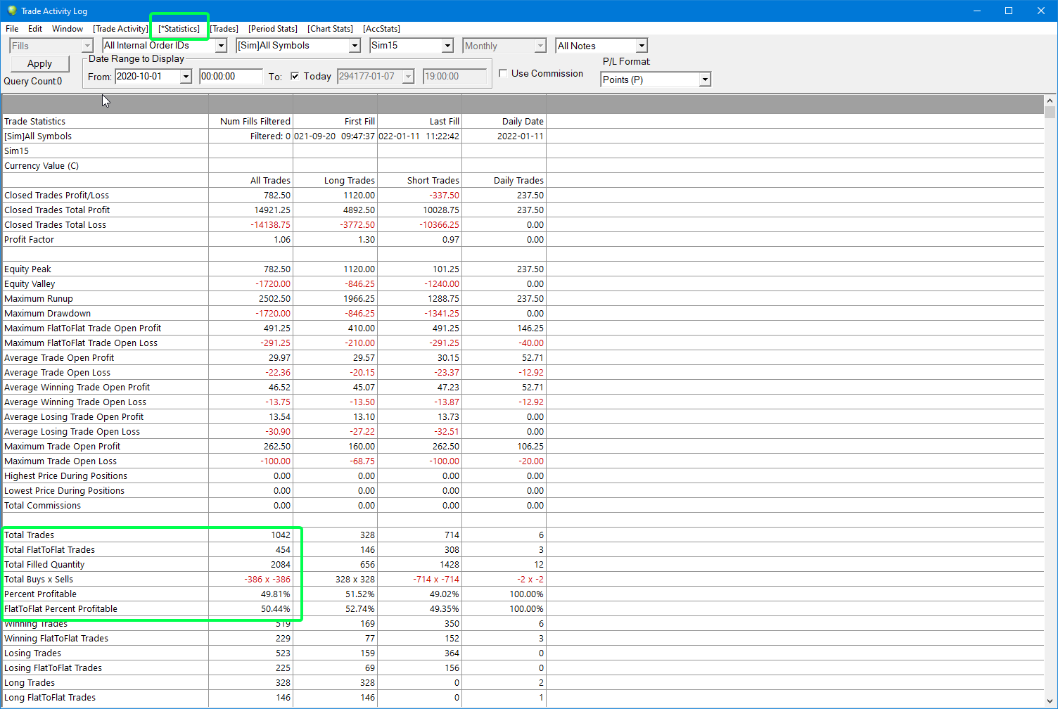 I do believe this is what you are looking for. See attached screen shots. The activity log is able to aggregate over different symbols. Only thing it can not do is aggregate $PnL only Points As you can see I've different contracts in my sim, and the statistic is calculating the win rates. |