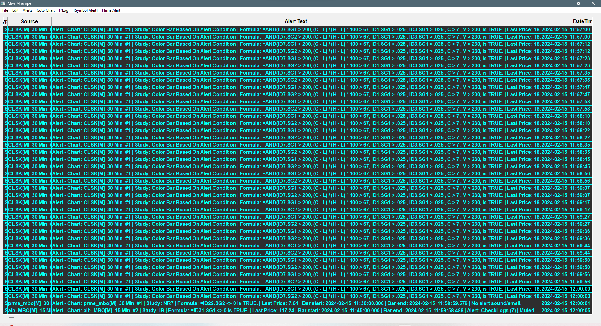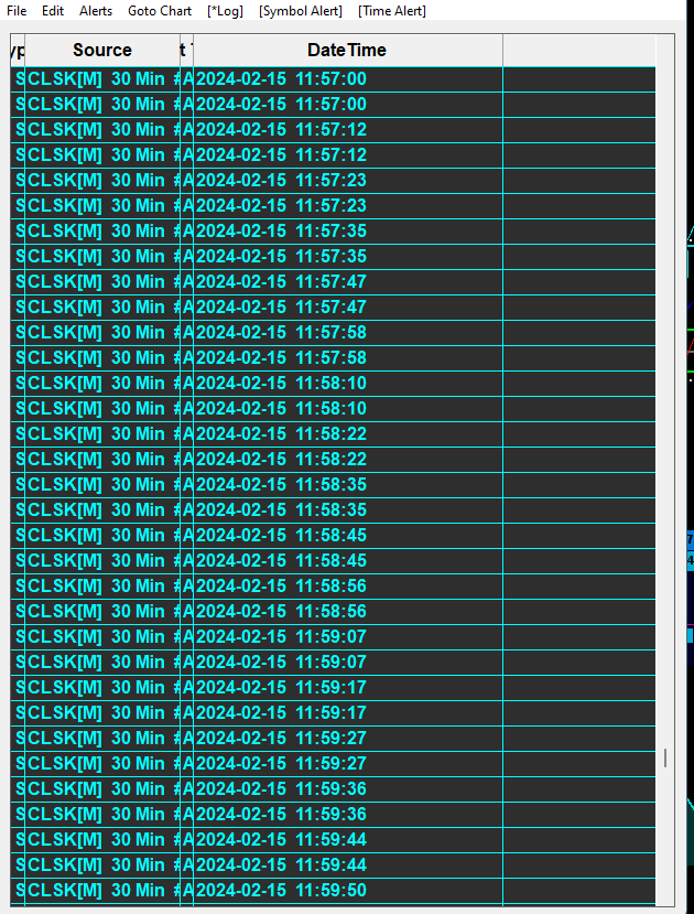 Thanks for the help, Yeah I am lost as well. It was working fine when scanning all the Nasdaq and NYSE symbols but that may have been because I was hitting limits I was not aware of. I found a way to use the historical scans and have a refined watchlist scan off off about 20 to 50 symbols now. It uses the same exact scan I was using but it had the alerts sound going off noin stop. The attached pic shows CLSK hitting my conditions a bit before noon. It set off an endless amount of alerts for this next few minutes. It did this with all of the stocks hitting my conditions all morning, non stop alert sounds. I have a study collection that is just for this scan and a chartbook I open, the associated watchlist and run the scan. I did find through my docs reading that there is an option in Chart > settings for alerts but did not want to play with that until I heard back. Thanks, |