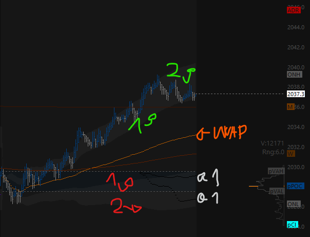Hello, See if I am able to explain this and make it understandable, if you don't understand something just ask me again. - See picture attached, 1 and 2 with green and red are standard deviations of FSVWAP (Full session VWAP from 17:00 to 16:00) - 1 and 2 in white are the 1st standard deviations of VWAP from RTH (08:00 to 13:30h). I am using a study supgraph to extract that from another chart (Trigger RTH on the chartbook) with RTH times. The study is working properly on RTH, but after the RTH session ends it show a wrong calculation until the next RTH open. Is there any way I could add a line stop time or similar to this indicator so it does't show a wrong calculation on my charts? Thank you again |