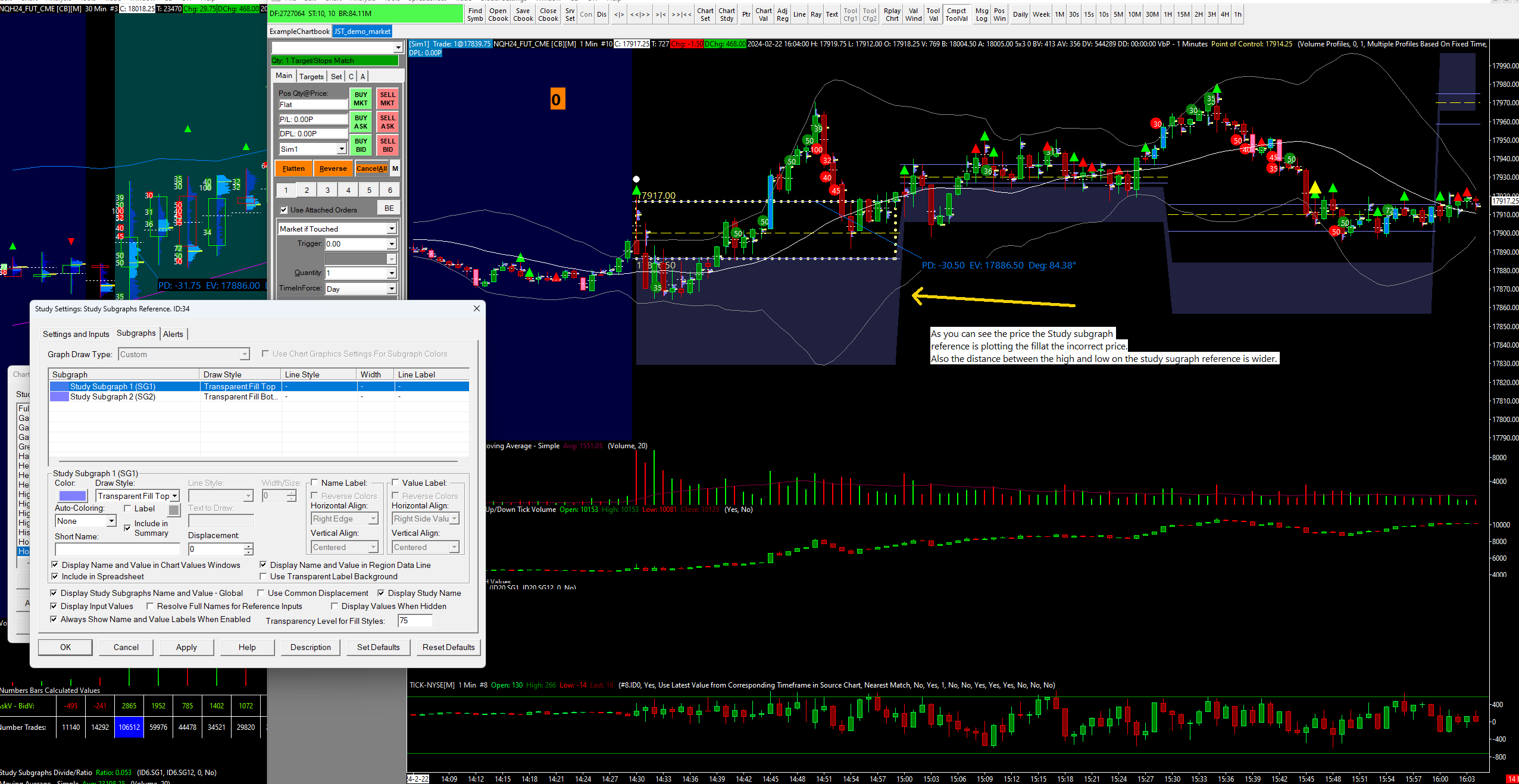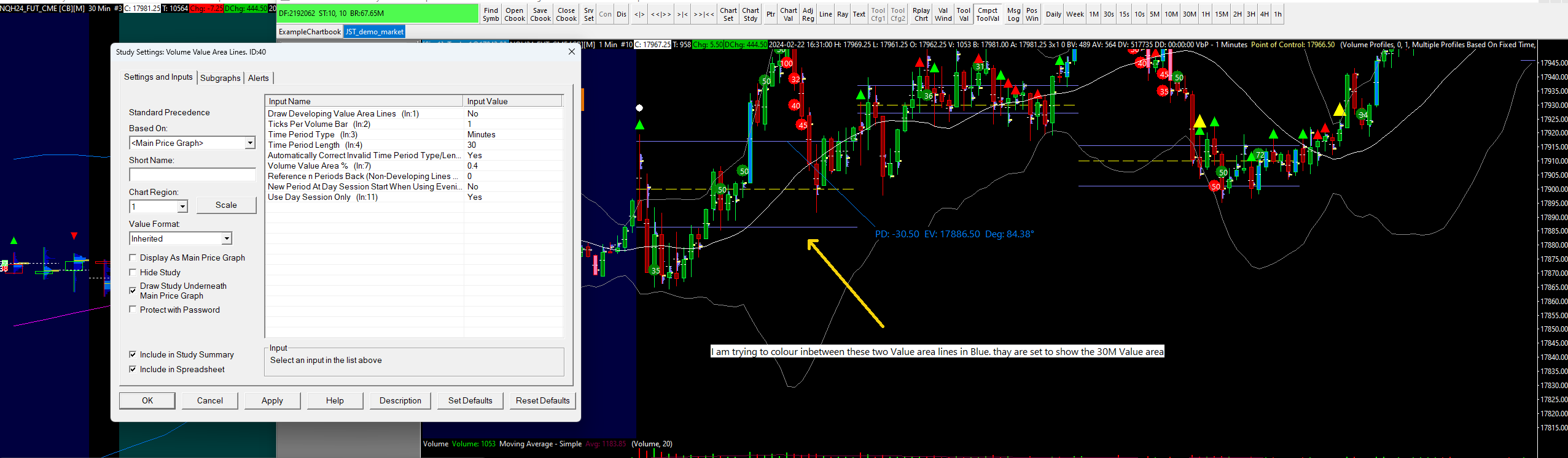 I am currently trying to fill the Volume value area lines using study subgraph reference I have added a Study subgraph reference and I have set input study 1 and 2 to correspond with the high and low value of the Volume value area lines High and low lines. the chart region for the Study subgraph reference is 8. when it is set to the this the levels of the high and low of the value area match the Value area lines study high and low correctly. However when I change the chart region to 1, so it will fill the lines on the Main chart. The Study subgraph reference high and low lines position changes and doesnt match the Value area lines study high and low What am I doing wrong?. How can I get them to match? Thanks for your help, appreciated. |