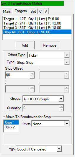 Hi there, I'm trying to use the OCO settings with scaled profit levels, and an all OCO groups stop. Target 1 - 12T, Qty 1 Target 2 - 24T, Qty 1 Target 3 - 36T, Qty 1 Stop All - 60T (Qty 3 based on the above) Using this on SIM everything works great. When I am using this with Interactive Brokers, 1. The Stop orders are being adjusted to 2 or 3 slightly different stop values (like 0.75 pt difference) 2. There are now multiple handles for the stop on the chart, so its hard to manage. See attached screenshot #1 - it shows the handles on Sierra Chart and also how the order is showing in TWS. It split the stop into orders with 2 different handles, with slightly different stop points. For the above I noticed I had the following settings * Server Side OCO orders : Yes * Server Side Bracket Orders : No When I set Server Side Bracket Orders ON, it seems to work ok, however I then get this message from IBKR when placing the orders: Warning: Your order was repriced so as not to cross a related resting order. However in this case the stops are NOT being adjusted - they're at the correct value, and the handle is fine in chart trader. (second screenshot) I just want to make sure I'm using the right settings - is there a way to avoid these issues? Any way to avoid these order repricing - I can't understand what order is 'crossed' here as they're all separate orders and I don't see any overlap. Also - I had expected the stop loss for "Stop All" would be a single separate order with quantity of 3 vs having three separate stop orders at the same value? Date Time Of Last Edit: 2024-03-04 18:06:19