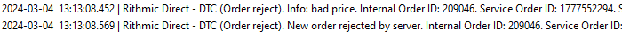 When I try to enter a limit order for a bid without compressing the ticks, it rejects the order and says the price is bad. 2024-03-04 13:13:08.452 | Rithmic Direct - DTC (Order reject). Info: bad price. Internal Order ID: 209046. Service Order ID: 1777552294. Symbol: NQH4.CME. 2024-03-04 13:13:08.569 | Rithmic Direct - DTC (Order reject). New order rejected by server. Internal Order ID: 209046. Service Order ID: 1777552294. Symbol: NQH4.CME. I've attached a screenshot of the message. |