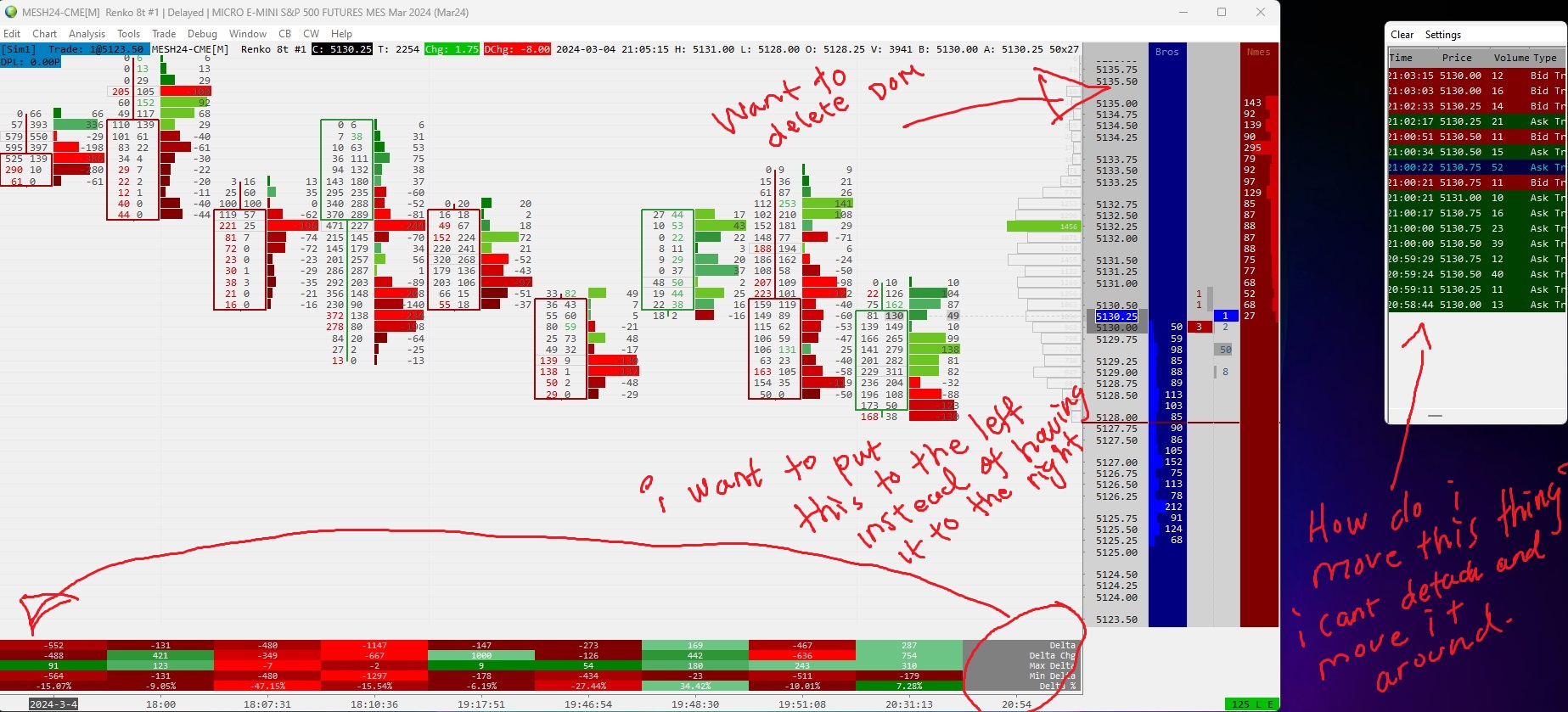 i have a chartbook and i want to get rid of somethings on this chartbook. 1: i want the delta, delta chg, max and min delta and delta % to be on the left side of the table not on the right 2: i want to get get rid of the DOM. 3: i want to be able to move time and sales around and detached but i cant. i have a picture of the chartbook and i also will upload it. i appreciate it somebody could help me. |
