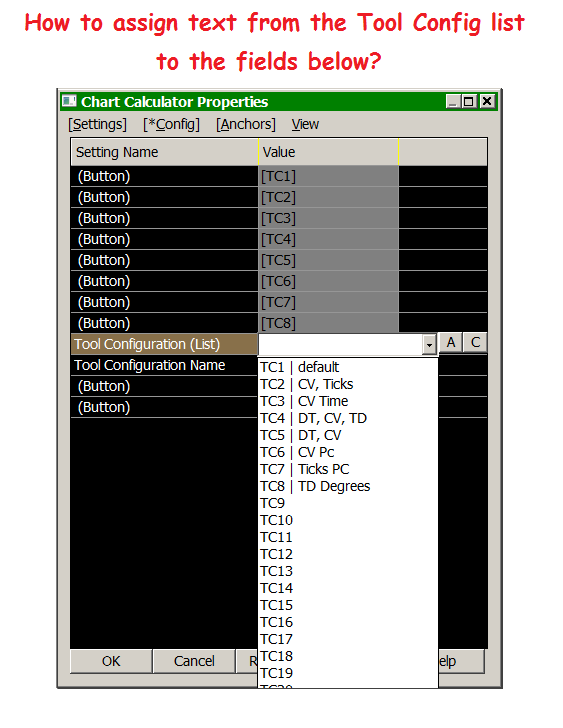 How to assign text from the Tool Config list to fields in the Chart Calculator Properties > Config window? |