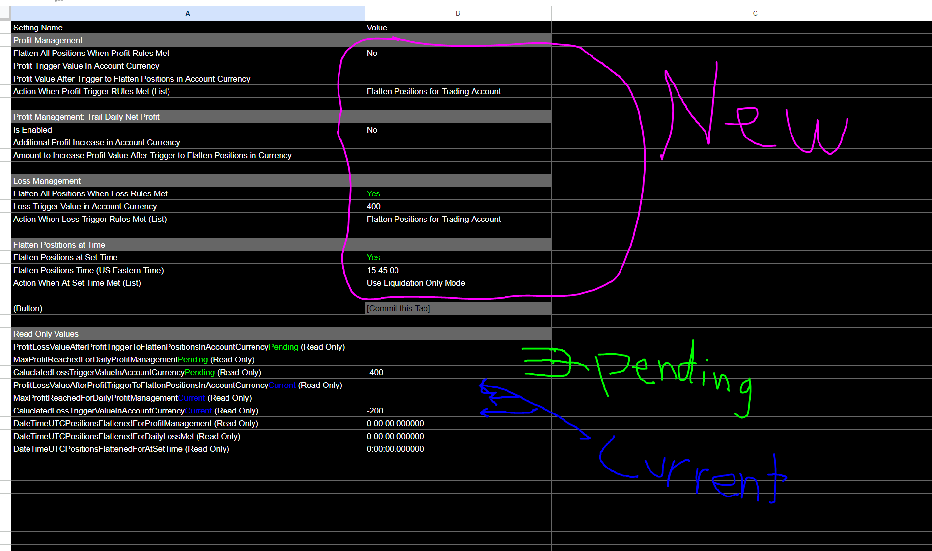 sorry, ill try explaining it differently as it might have been hard to grasp. heres the logic i think teton should use/be so that users can use the read only values to confirm what teton is doing: 0. trader sets new-values and hits commit 1. teton stores the new-values and displays they have been saved/updated under pending-values (so the user can see teton accepted the new-values) 2. then at 5:30pm est, teton takes the pending-values and sets them as the current-values 3. the current-values then cannot be changed or updated by anyone for the FULL duration of the next trading session until the next 530pm est update 4. teton executes all rules met using the current-values making it so that the Profit/Loss Management settings are set in stone, thus making it so that there is "no way around this, because risk management must be strictly followed for it to be effective." - SC engineering (img 321) I did upload a sample of what the read only area could look like (sample read onlys) right now there is a loophole, and im just trying to help close it :) |