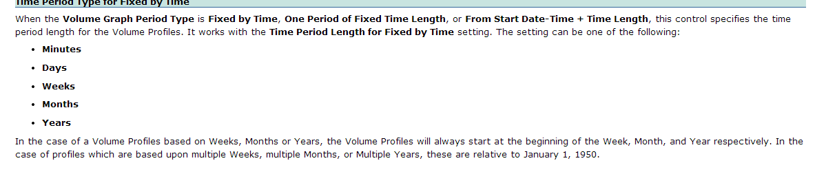 This is what I've been reading, and would indicate I should set to daily? Time Period Type for Fixed by Time When the Volume Graph Period Type is Fixed by Time, One Period of Fixed Time Length, or From Start Date-Time + Time Length, this control specifies the time period length for the Volume Profiles. It works with the Time Period Length for Fixed by Time setting. The setting can be one of the following: Minutes Days Weeks Months Years In the case of a Volume Profiles based on Weeks, Months or Years, the Volume Profiles will always start at the beginning of the Week, Month, and Year respectively. In the case of profiles which are based upon multiple Weeks, multiple Months, or Multiple Years, these are relative to January 1, 1950. |