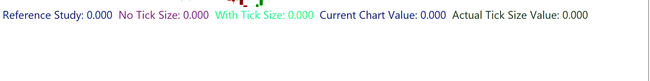 Okay I understand the rationale for the string formatting comment. I did however, implement the string conversion per the documentation as I've done several times before with no issues. To further investigate the issue I structured an experiment. My goal is to read in data from a study, compare it to some level, and divide by the sc.TickSize. I'm dividing by the sc.TickSize to normalize the values as this is being run via "Start Scan" from the Chart Menu. Experiment: I computed a metric (i.e. simple deviation of current High from value of study). I computed this metric 1) using the sc.TickSize and 2) without using the sc.TickSize I then stored the values of both in a Subgraphs. I also stored the High used to compute the metric in a subgraph as well as the reference study output and the sc.TickSize. See Below: //reference from study stored in sc.Subgraph[0] //No Tick Size sc.Subgraph[5][sc.Index]=abs((sc.Subgraph[0][sc.Index-1]-sc.High[sc.Index-1])); //With Tick Size sc.Subgraph[6][sc.Index]=abs((sc.Subgraph[0][sc.Index-1]-sc.High[sc.Index-1]))/sc.TickSize; //High sc.Subgraph[7][sc.Index]=sc.High[sc.Index]; //Store sc.TickSize sc.Subgraph[8][sc.Index]=sc.TickSize //Graphs //Reference Study sc.Subgraph[0].Name="Reference Study"; sc.Subgraph[0].DrawStyle=DRAWSTYLE_LINE; sc.Subgraph[0].PrimaryColor = RGB(8, 25, 128); sc.Subgraph[0].LineWidth = 4; sc.Subgraph[0].DrawZeros = false; sc.Subgraph[0].DisplayNameValueInDataLine=true; //Current High sc.Subgraph[7].Name="Current Chart Value"; sc.Subgraph[7].DrawStyle=DRAWSTYLE_LINE; sc.Subgraph[7].PrimaryColor = RGB(8, 25, 128); sc.Subgraph[7].LineWidth = 4; sc.Subgraph[7].DrawZeros = false; sc.Subgraph[7].DisplayNameValueInDataLine=true; //No Tick Size sc.Subgraph[5].Name="No Tick Size"; sc.Subgraph[5].DrawStyle=DRAWSTYLE_LINE; sc.Subgraph[5].PrimaryColor = RGB(128, 25, 128); sc.Subgraph[5].LineWidth = 4; sc.Subgraph[5].DrawZeros = false; sc.Subgraph[5].DisplayNameValueInDataLine=true; //With Tick Size sc.Subgraph[6].Name="With Tick Size"; sc.Subgraph[6].DrawStyle=DRAWSTYLE_LINE; sc.Subgraph[6].PrimaryColor =RGB(18, 255, 128); sc.Subgraph[6].LineWidth = 4; sc.Subgraph[6].DrawZeros = false; sc.Subgraph[6].DisplayNameValueInDataLine=true; //With Tick Size sc.Subgraph[8].Name="Actual Tick Size Value"; sc.Subgraph[8].DrawStyle=DRAWSTYLE_LINE; sc.Subgraph[8].PrimaryColor =RGB(18, 55, 18); sc.Subgraph[8].LineWidth = 4; sc.Subgraph[8].DrawZeros = false; sc.Subgraph[8].DisplayNameValueInDataLine=true; I've attached the screenshot of the output from each of the subgraphs. TickSize is still 0 when simply storing the value to subgraph. Also, the sc.High[sc.Index] of the current chart is 0 as well as each of the subgraph outputs. How do you advise to correct this? |