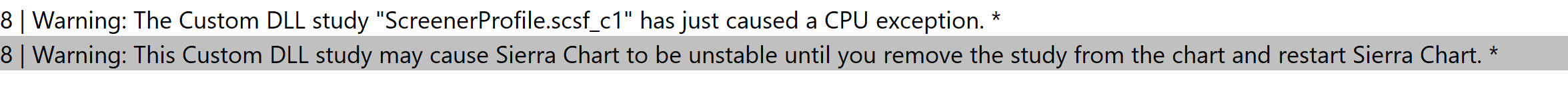 I believe I found the issue. I created a simple study just to output the sc.TickSize value.(see below) #include "sierrachart.h" using namespace std; SCDLLName("ShowTickSize") void GetTickSize(SCStudyInterfaceRef sc){ //store tick size in subgraph sc.Subgraph[0][sc.Index]=sc.TickSize; } SCSFExport scsf_c1( SCStudyInterfaceRef sc) { //Inputs if (sc.SetDefaults){ //set graph defaults sc.GraphName= "ShowTickSize"; //Reference Study sc.Subgraph[0].Name="Tick Size"; sc.Subgraph[0].DrawStyle=DRAWSTYLE_LINE; sc.Subgraph[0].PrimaryColor = RGB(8, 25, 128); sc.Subgraph[0].LineWidth = 4; sc.Subgraph[0].DrawZeros = false; sc.Subgraph[0].DisplayNameValueInDataLine=true; } //display entries and exits on main graph instead of subgraph sc.GraphRegion=1; GetTickSize(sc); return; }; When running this study as in my primary study, I noticed that sc.TickSize is 0 sometimes and sometimes it returns the actual ticksize. I checked the message logs and received an error stating that there was a CPU exception and the study made the platform unstable until removing it and restarting the platform. I believe this explains why sc.TickSize was 0 in the prior posts. I've attached examples of running this simple study via a scan which shows sometimes the return value is correct and sometimes it is 0. Ideally, removing the study and restarting the platform should correct this per the message logs. |