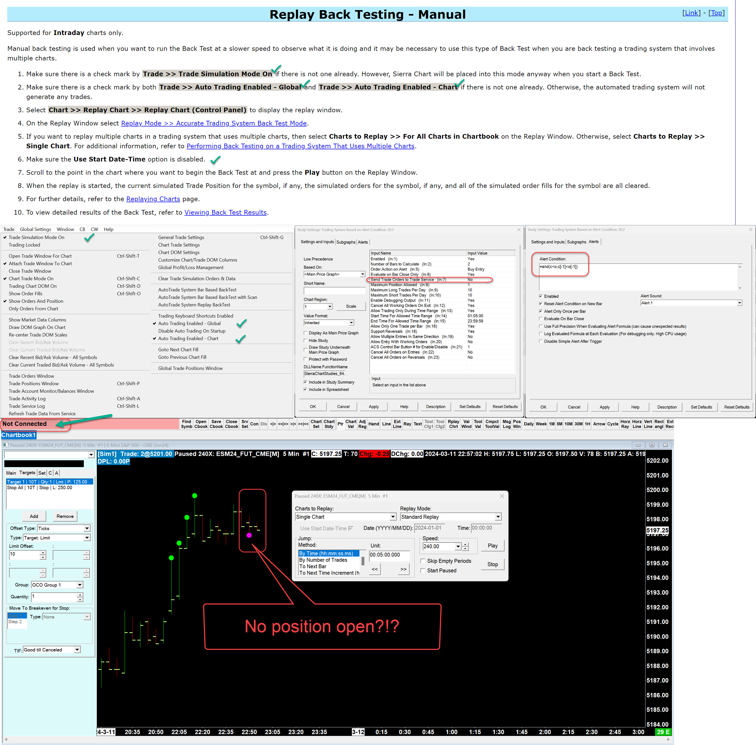 Hi SC Support, I am new to SC although I have read Auto Trade System Back Testing: Introduction and tried to followed the instruction but my test auto-trading system not open any position. I tried to do replay back testing. Below what I have done: 1) I have already set : Trade >> Trade Simulation Mode On 2) also flagged : Trade >> Auto Trading Enabled - Global and Trade >> Auto Trading Enabled - Chart 3) in the study setting : Not Use Start Date-Time 4) disconnected before I started the back testing I tested on M5 ESM24 symbol but it didn't open any new position. Please check my screenshot for detail of my settings and let me know if I missed anything. Please assist. Thank you. Ken |