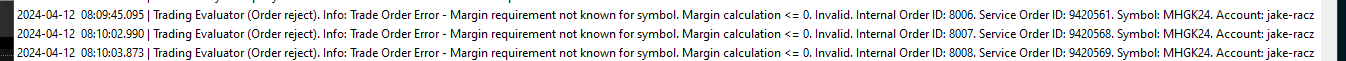 Hi, I tried to execute a trade in MHG on Friday and nothing happened. I will attach an image of the message in my trade service log. It said that margin requirement not known for the symbol. I tried to follow the steps outlined in a previous post in the margin settings but it says the operation isn't allowed. The firm I am doing a tryout for said to contact you. Thanks, Jake |