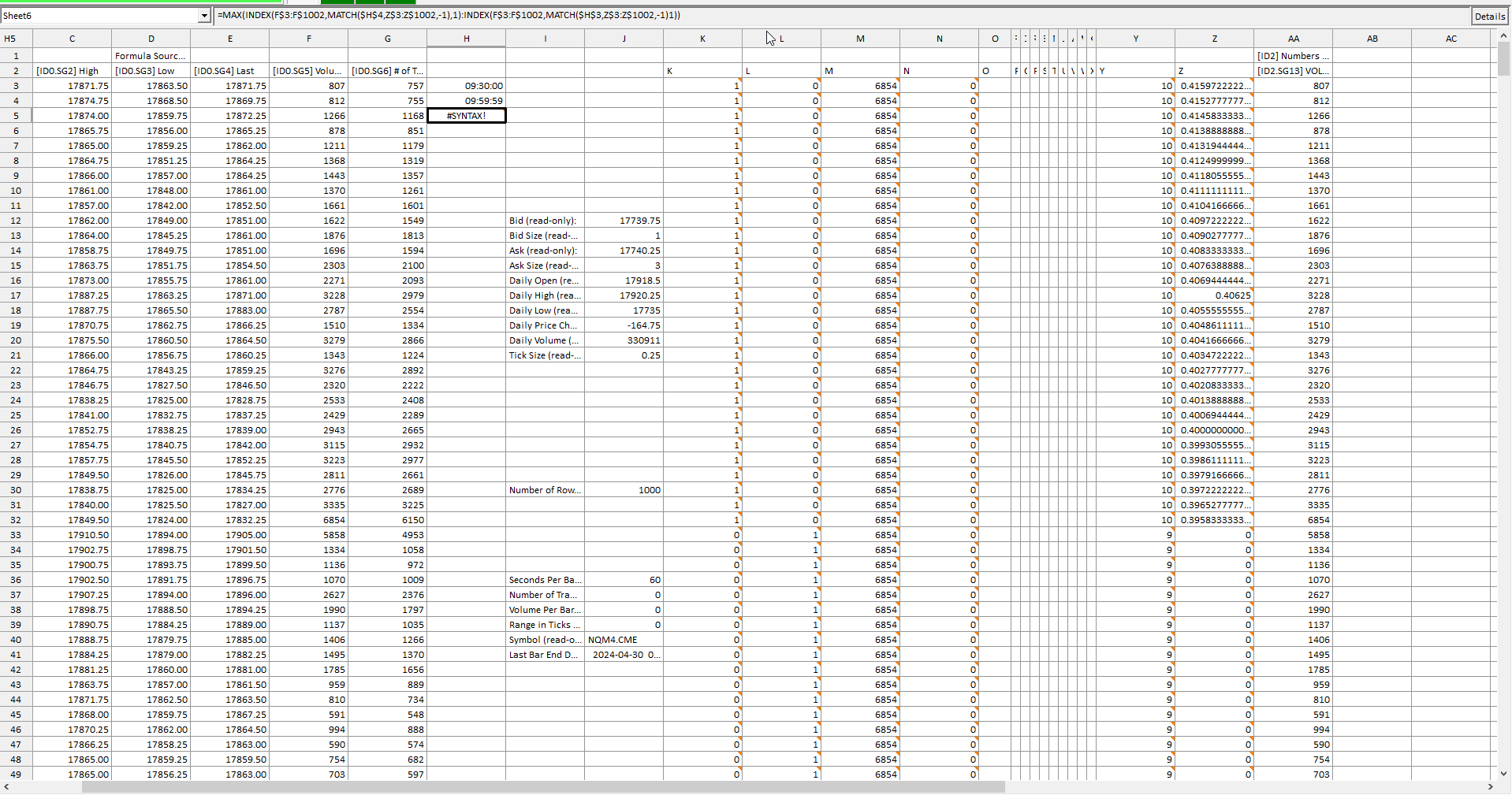 Thanks for your feedback. I followed the example and put the following elements : Y3 : =IF(INT(A3)>INT(A4),Y4+1,Y4) Z3 : =IF(Y3=MAX(Y$3:Y$1002),A3-INT(A3),0) H3 : 09:30:00 H4 : 09:59:59 (Even if you put 10:00:00) H5 : =MAX(INDEX(F$3:F$1002,MATCH($H$4,Z$3:Z$1002,-1),1):INDEX(F$3:F$1002,MATCH($H$3,Z$3:Z$1002,-1)1)) But it doesn't work, it puts me #SYNTAX! ...Even with SUM instead of MAX, as in the example. I also tried putting AA instead of F. Date Time Of Last Edit: 2024-04-30 15:56:52