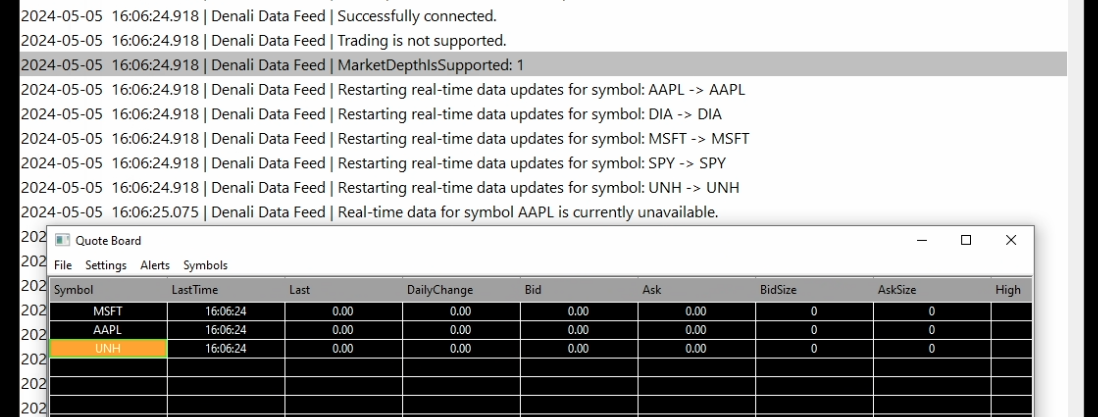 Hi SC Engineering, It's been such a productive weekend when I tried to get something done with SC. I appreciate the weekend replies SC staff have given. Trying to get a quoteboard/quote spreadsheet set up, here's is what I am looking at. 2024-05-05 16:06:24.918 | Denali Data Feed | Restarting real-time data updates for symbol: AAPL -> AAPL 2024-05-05 16:06:24.918 | Denali Data Feed | Restarting real-time data updates for symbol: DIA -> DIA 2024-05-05 16:06:24.918 | Denali Data Feed | Restarting real-time data updates for symbol: MSFT -> MSFT 2024-05-05 16:06:24.918 | Denali Data Feed | Restarting real-time data updates for symbol: SPY -> SPY 2024-05-05 16:06:24.918 | Denali Data Feed | Restarting real-time data updates for symbol: UNH -> UNH 2024-05-05 16:06:25.075 | Denali Data Feed | Real-time data for symbol AAPL is currently unavailable. 2024-05-05 16:06:25.075 | Denali Data Feed | Received security definition for symbol AAPL 2024-05-05 16:06:25.075 | Denali Data Feed | Real-time data for symbol DIA is currently unavailable. 2024-05-05 16:06:25.075 | Denali Data Feed | Received security definition for symbol DIA 2024-05-05 16:06:25.075 | Denali Data Feed | Real-time data for symbol MSFT is currently unavailable. 2024-05-05 16:06:25.075 | Denali Data Feed | Received security definition for symbol MSFT 2024-05-05 16:06:25.075 | Denali Data Feed | Real-time data for symbol SPY is currently unavailable. 2024-05-05 16:06:25.075 | Denali Data Feed | Received security definition for symbol SPY 2024-05-05 16:06:25.075 | Denali Data Feed | Real-time data for symbol UNH is currently unavailable. 2024-05-05 16:06:25.075 | Denali Data Feed | Received security definition for symbol UNH Here are a few things I've tried: 1. Setting Data/Trade Service to "SC Data" - Same deal - checking/unchecking "Support for SC Data Feed" - Same deal. 2. Setting Data/Trade Service to "Teton" - Same deal - checking/unchecking "Support for SC Data Feed" - Same deal. 3. Manually deleting every .scid in "/Data" folder (there aren't many, but I've nuked them all) - Same deal. So the quoteboard is not supposed to work when the market is closed, I assume? Or opening a new quoteboard with some new symbols outside of market hours are not supported? Because I know it works during market hours. What I am trying to accomplish here is dead simple - I would like to have a centralized list to see where each instrument closed after a market session ended. |