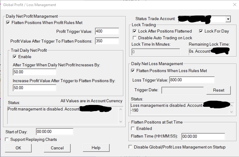 Hey, I want to set my daily risk and profit goal, once reach the account will be lock for trading for the day can you tell me if I understood it correctly if I set the Profit Trigger Value - 400$ and the Profit Value after Trigger to Flatten Position 350$ so once i'm in a position and the it reach 400$ on the day, when it back to 350$ it will be flatten and lock traing for the day? also if i unable Trail Daily Net Profit and After Trigger When Daily Net Profit Increase by 50$ Increase Profit Value After Trigger to Flatten position by 50$ meaning if it reach 400$ and then continue to go up to 500$, it will be flatten & lock when it back again to 450$ ? also I want to set daily loss for 800$ can you please check in the attach image that all done correctly? |