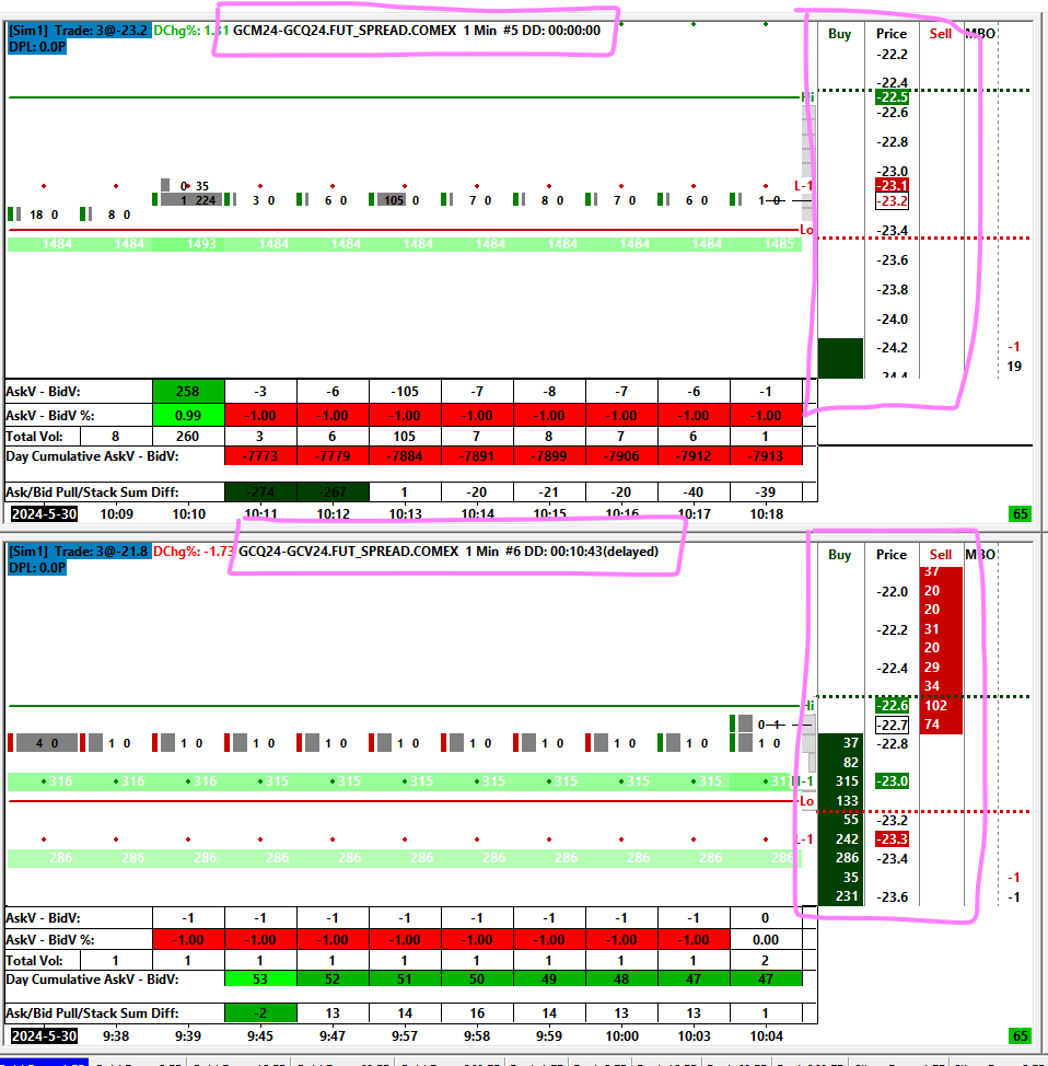 In this example, I have two charts, one above the other. The top is the Jun/Aug Gold Calendar Spread, the bottom is the Aug/Oct. You can see that the book is not working in the top. There is data coming thru somewhere tho because you can see the 1485 at the bid at -23.5 on the Market Depth Historical Graph. |