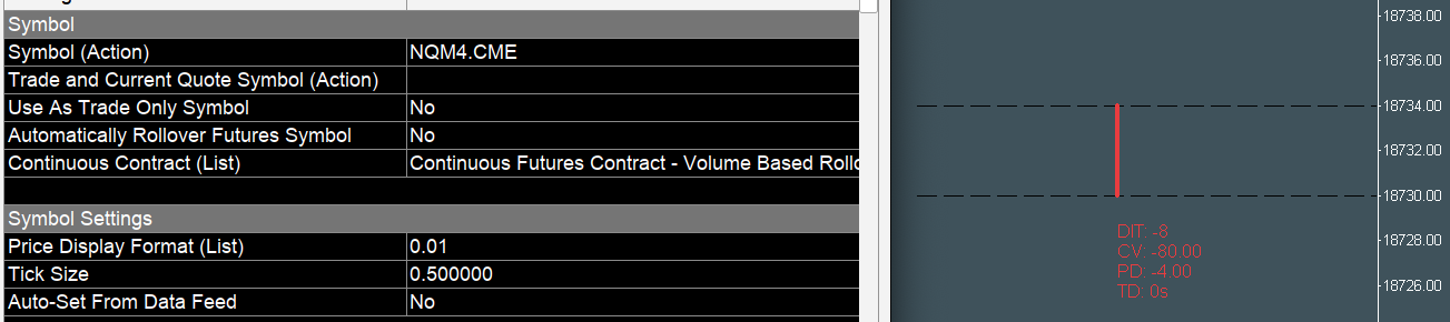 Hello, When Tick Size under Chart Settings > Symbol is changed, the Chart Calculator tool returns incorrect values, i.e. it measures "compressed ticks" vs actual ticks. Suppose I opened an NQ chart, where the exchange-defined Tick Size is 0.25, then measured a difference between two prices using the Chart Calculator tool. Say the difference is 16 ticks. If I go and change Tick Size on the chart to 0.5, the same measurement will now show a difference of 8 ticks, which is obviously incorrect. The same issue applies to Currency Value, but not to Point Difference. See attached screenshots for details. |