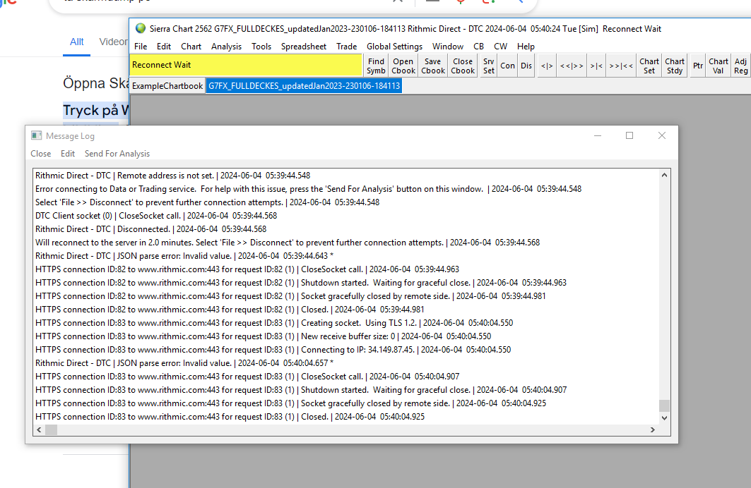 Hi, I need help. I can t connect to Sierra Chart. It says reconnect wait. I have tried to reconnect it but doesnt work. |