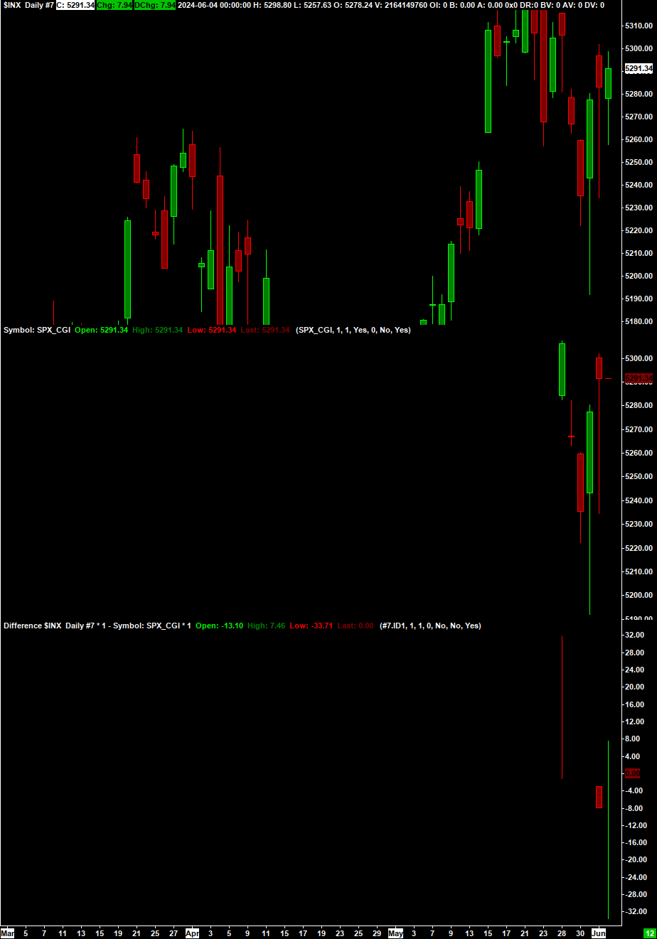 SPX_CGI not having historical data is a big issue. You say that $INX should be used. Why do you not simply copy over the data from $INX.dly (which goes back to 1980-01-02) to SPX_CGI.dly on the server??? But there are more issues: The historical data in $INX.dly and SPX_CGI.dly is different! How can this be, if both are supposed to represent the S&P500 index??? Image documenting the deltas: https://www.sierrachart.com/image.php?Image=1717537856543.png Please explain what the true data sources for these symbols are! And what are the volume numbers in SPX_CGI supposed to mean??? For intraday these are trivial numbers (1 second = volume 1). For historical these cannot be interpreted. Please explain! And furthermore, the historical volume numbers of SPX_CGI are also different from the volume numbers of $INX. And the $INX volumes are definitely closer to reality. Date Time Of Last Edit: 2024-06-04 22:17:18