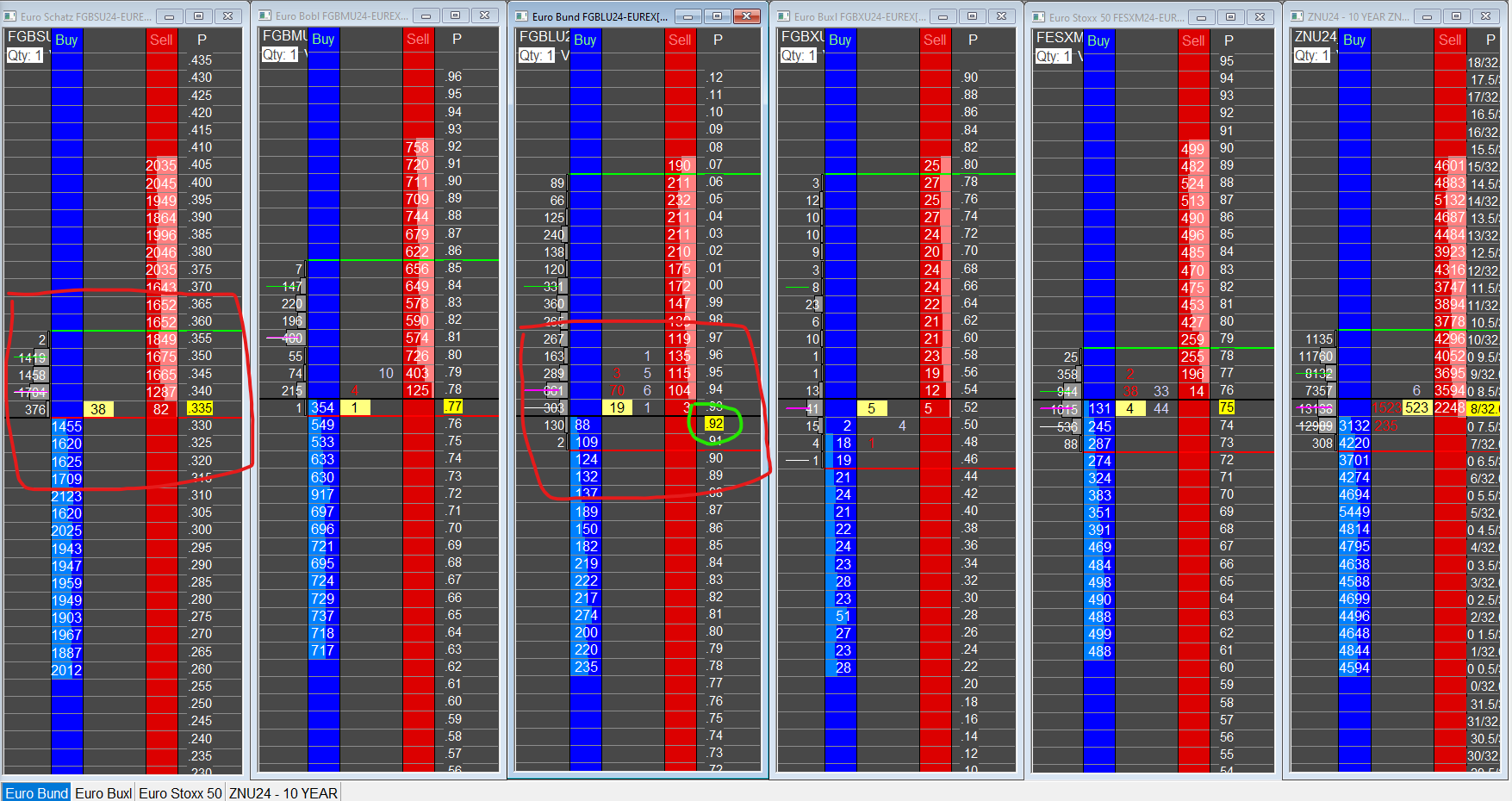 Hi, I found that when using the DOM occasionally the center-line will be located a tick below where it should. I have only found this problem on euro schatz and bund futures (currently september/U contract), as I use the exact same DOM/Studies/settings on multiple other products (including other euro bond futures) and it is only these two products that I have found affected. In the screenshot, on the Bund/3rd DOM from left that the highlight of last traded price, circled in green, is lagging behind the current print/market order, which could have an affect. It does not seem to be the result of the custom study for the price column, as I have tested this with and without the study, as well as having this study active on other DOMs without issue. Is there a setting that I have accidentally changed somewhere that causes this? Or is this a bug that can be fixed when time permits? Thank you! |