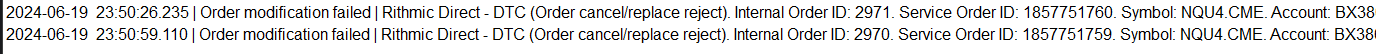 This only started happening recently but I'm experiencing problems closing and opening trades on Rithmic "prop" accounts with Apex/Bulenox. I'm using Denali data and only placing the trades using those accounts. I wasn't really concerned because it seemed like it was isolated to Rithmic port issues with Apex being overloaded and I was largely unaffected for the past 6 weeks save for the last 2 weeks. Figuring it was Apex I decided to give Bulenox a shot. And as of this evening, I'm experiencing issues on a new Rithmic eval account. When I move stop or take I am getting error messages popping up and I'm not able to decipher it. I'm also experiencing orders hanging when trying to close. Sometimes the order won't flatten immediately or I have to flatten several times. Then takes and stops will be hung on the screen. Sometimes a reconnect clears them. To me it's 100% Rithmic issues but I thought I would run it by you guys and get your input on it. Here's the catch. The popular C# garbage platform these companies recommend doesn't seem to be experiencing these errors. Can you offer any insight? Thank you! Date Time Of Last Edit: 2024-06-20 07:58:04