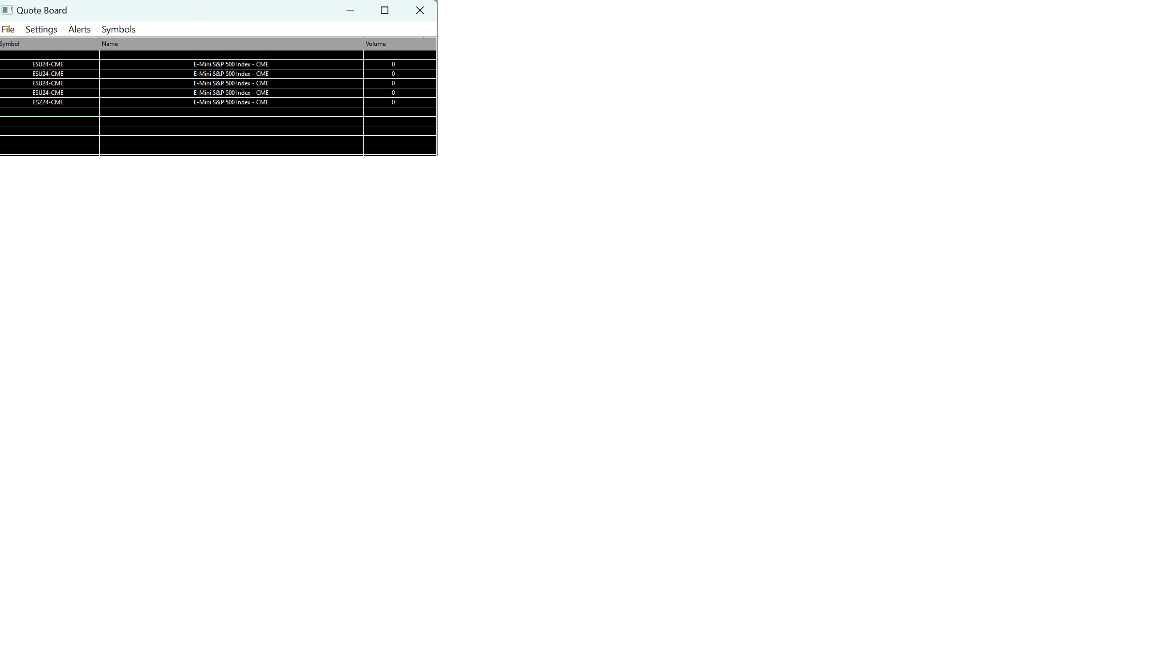Hi! I am currently viewing the ESU24-CME product and while I can get a one off load of data when I first open Sierra Chart, the delayed feed is not updating and the Quote Board just says 0. I've tried clicking Edit > Translate Symbols to Current Service but that didn't help. Many thanks, R |