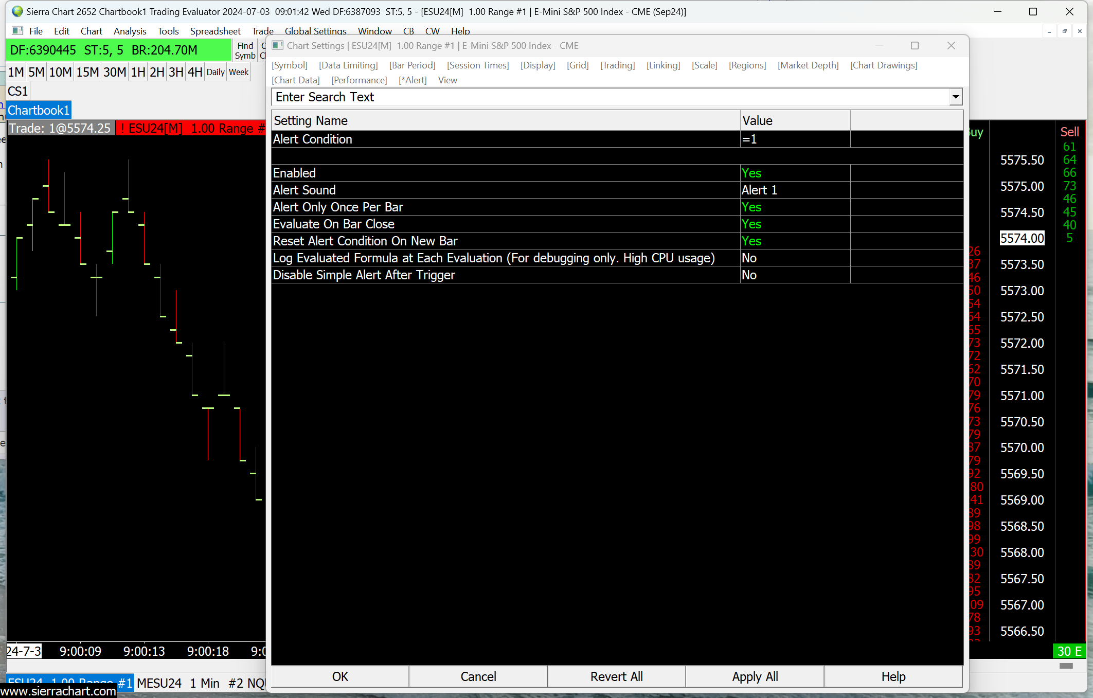 Attached is an image showing the settings. The one item that we forgot to mention is that you need to have "Reset Alert Condition on New Bar" set to "Yes".
