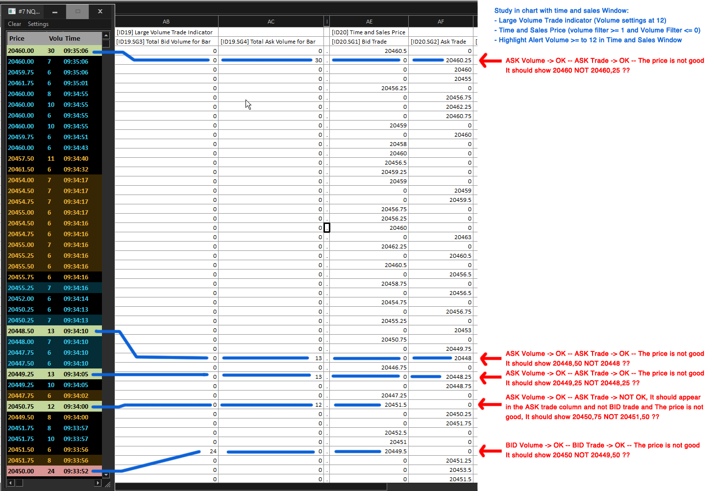 Hello, I would like to send a message because I can't solve my problem. What I'm trying to do is to output the price level of large volume trades as we can see them on the time and sales window or on a chart with the Study "Large volume trade indicator" (Time and sales window and large trade on chart give the same results). I tried to get the price with the Study "Time and sales price" but it doesn't fit at all. I am attaching 2 screenshots to show and explain the problem. I would like to point out that the trade combination parameters are identical for the graph and the time and sales window. Does anyone have an idea to solve the problem or if there is a study already done to obtain this information ? Thank you so much ! |