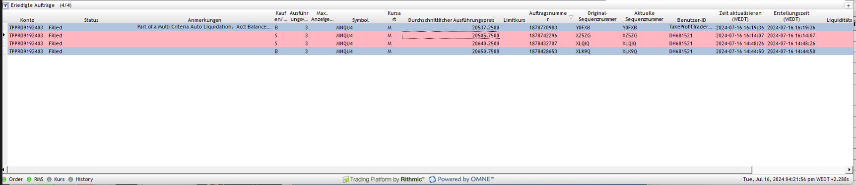 Hello, I traded a simulated funded account from a prop firm with Rithmic data fee and the order placement were always correct. I had no issues before. However on Tuesday (07/16/2024) at 9:14 AM CT, I placed a market order at the price level 20640.00 (Micro E-Mini Nasdaq 100) and wanted to sell three micro contracts. The Nasdaq was trading around the price level of 20640.00, at the time I placed the order, once I entered the order I was filled at the following price level: 20505.7500 This means that there was a slippage of more then 100 Index Points. What can I do to prevent such an issue from further happening ? Do you noticed any issue from the Rithmic server side at this time ? Thank you. |