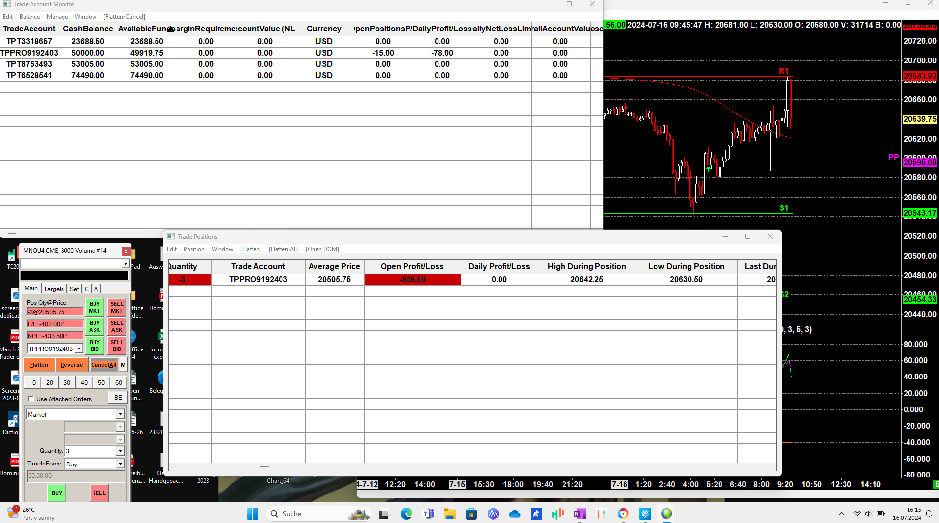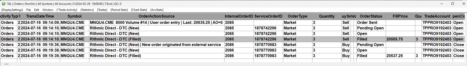 I looked at Trade Activity Log and the InternalOrderID is 2085. I attached screenshots where you can see the current market level 20622.50 and fill price was 20505.75. Chart mode was "on" and the red horizontal line is the executed price, basically it filled on Mondays low (7/15/2024) and trade position window showed 20642.25 High During Position and 20630.50 Low During Position - this even doesn't link together. Normally the fill price should be between High and Low During Position.